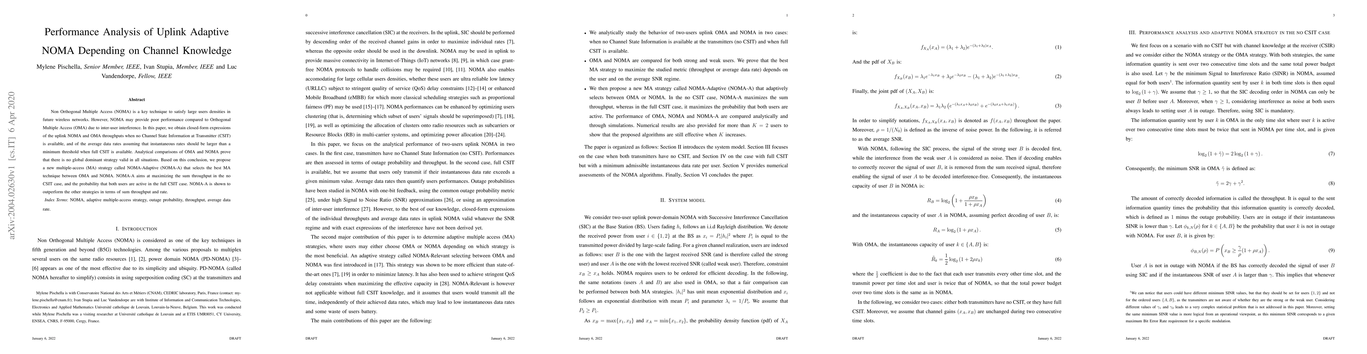 A new adaptive multiple-access strategy (NOMA-Adaptive) is proposed to select between Orthogonal Multiple Access (OMA) and Non-Orthogonal Multiple Access (NOMA) based on channel conditions, outperforming other strategies in terms of sum throughput and rate.