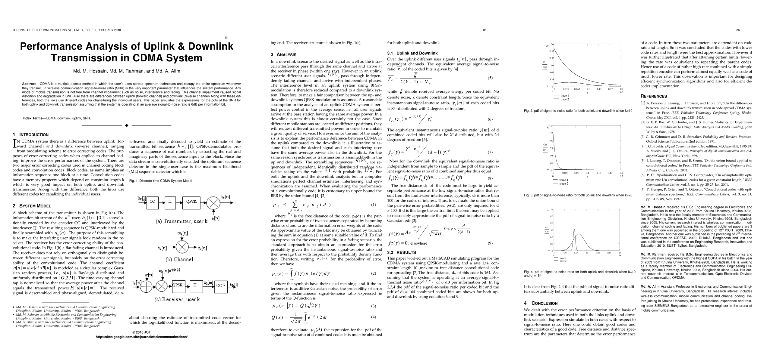 This paper analyzes the performance of uplink and downlink transmission in CDMA systems, focusing on signal-to-noise ratio (SNR) degradation due to channel impairment. The study simulates SNR pdfs for both links with an average 6dB SNR per information bit.
