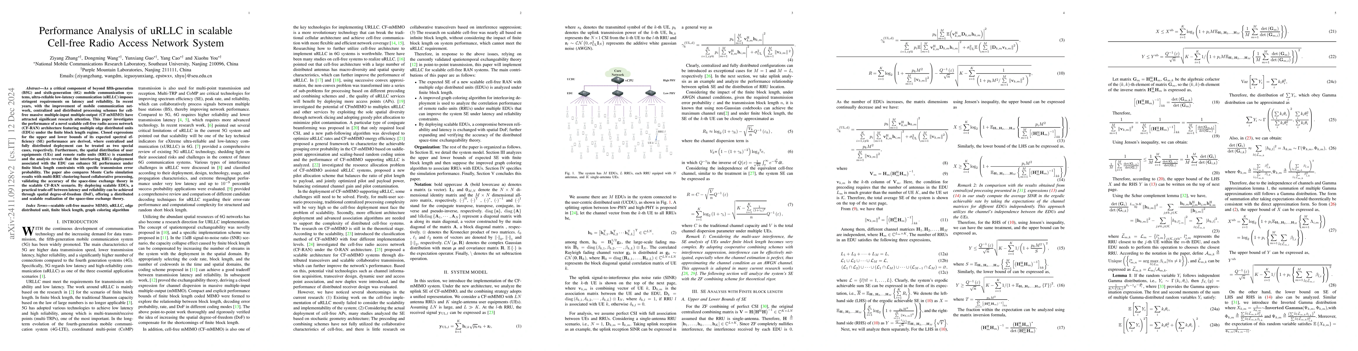 As an essential part of mobile communication systems that beyond the fifth generation (B5G) and sixth generation (6G), ultra reliable low latency communication (uRLLC) places strict requirements on latency and reliability. In recent years, with the improvement of mobile communication network performance, centralized and distributed processing of cell-free mMIMO has been widely studied, and wireless access networks (RAN) have also become a widely studied topic in academia. This paper analyzes the performance of a novel scalable cell-free RAN (CF-RAN) architecture with multiple edge distributed units (EDUs) in the scenario of finite block length. The upper and lower bounds on its spectral efficiency (SE) performance are derived, and the complete set's formula and distributed processing can be used as their two exceptional cases, respectively. Secondly, the paper further considers the distribution of users and large-scale fading models and studies the position distribution of remote radio units (RRUs). It is found that a uniform distribution of RRUs is beneficial for improving the SE of finite block length under specific error rate performance, and RRUs need to be interwoven as much as possible under multiple EDUs. This is different from traditional multi-node clustering centralized collaborative processing. The paper compares the performance of Monte Carlo simulation and multi-RRU clustering group collaborative processing. At the same time, this article verifies the accuracy of the space-time exchange theory in the CF-RAN scenario. Through scalable EDU deployment, a trade-off between latency and reliability can be achieved in practical systems and exchanged with spatial degrees of freedom. This implementation can be seen as a distributed and scalable implementation of the space-time exchange theory.
