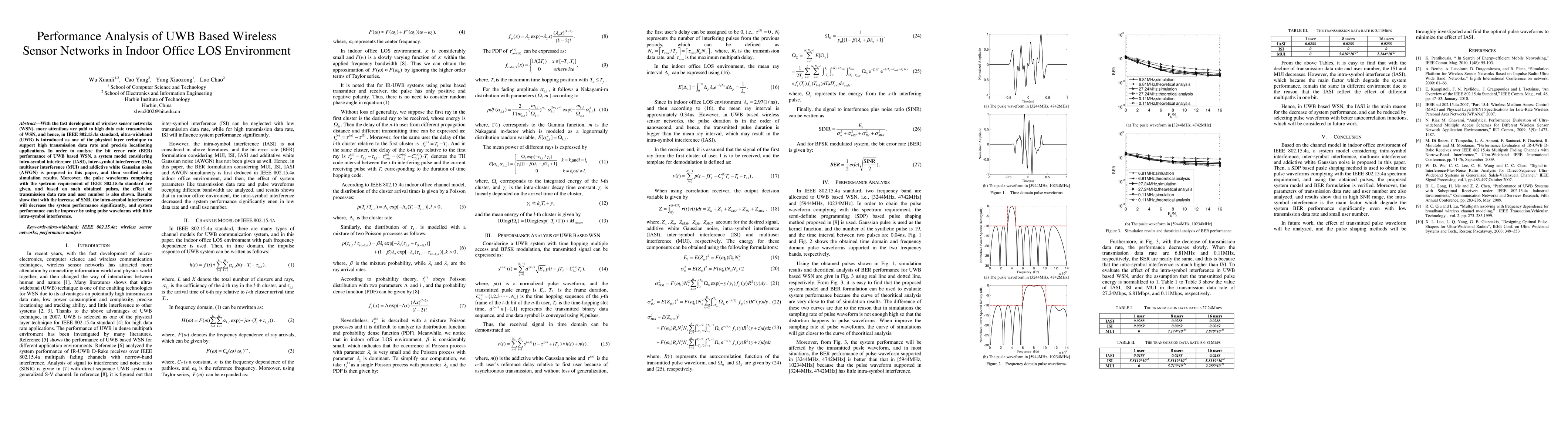 This paper analyzes the performance of UWB-based wireless sensor networks in indoor office environments, focusing on the bit error rate under various interferences. Simulation results show that intra-symbol interference notably degrades performance, but using pulse waveforms with minimal intra-symbol interference can enhance system performance.