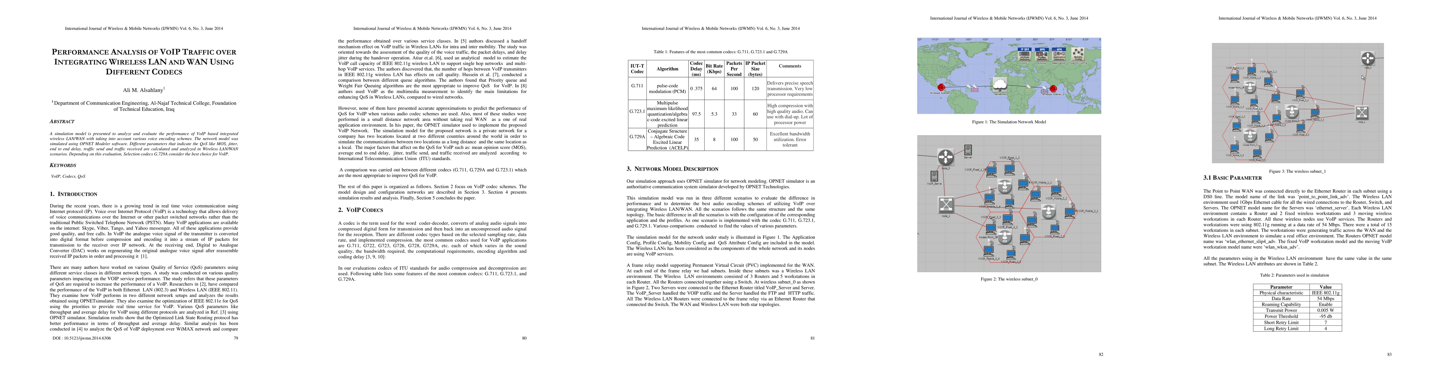 Summary: This study evaluates VoIP performance over integrated wireless LAN/WAN using various codecs through a simulation model in OPNET Modeler. Parameters like MOS, jitter, and delay were analyzed, leading to the conclusion that G.729A codec offers the best QoS for VoIP traffic.