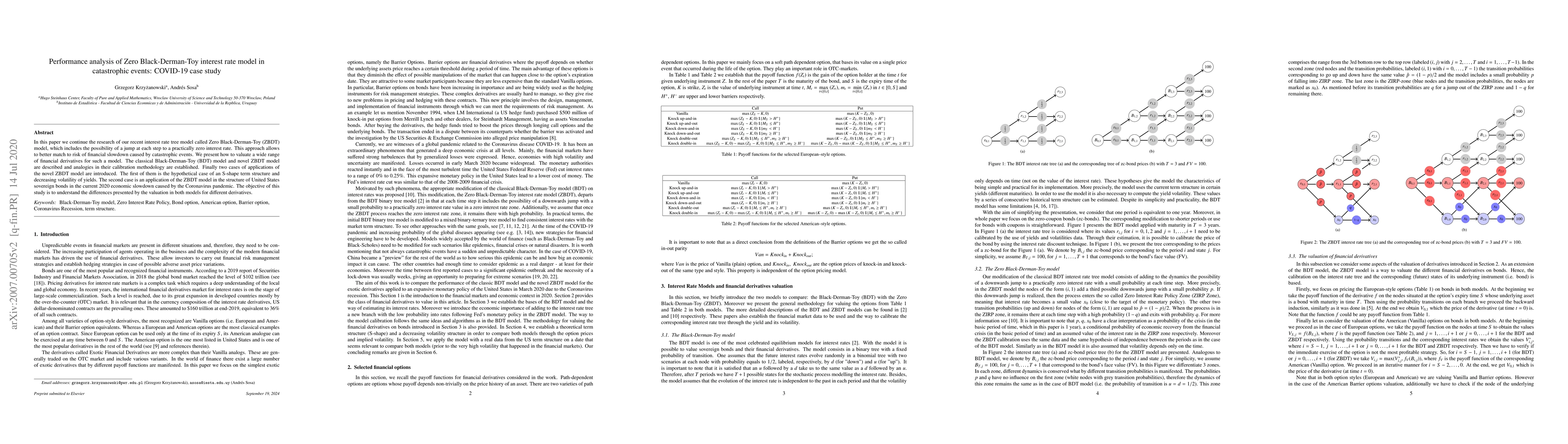 In this paper we continue the research of our recent interest rate tree model called Zero Black-Derman-Toy (ZBDT) model, which includes the possibility of a jump at each step to a practically zero interest rate. This approach allows to better match to risk of financial slowdown caused by catastrophic events. We present how to valuate a wide range of financial derivatives for such a model. The classical Black-Derman-Toy (BDT) model and novel ZBDT model are described and analogies in their calibration methodology are established. Finally two cases of applications of the novel ZBDT model are introduced. The first of them is the hypothetical case of an S-shape term structure and decreasing volatility of yields. The second case is an application of the ZBDT model in the structure of United States sovereign bonds in the current $2020$ economic slowdown caused by the Coronavirus pandemic. The objective of this study is to understand the differences presented by the valuation in both models for different derivatives.