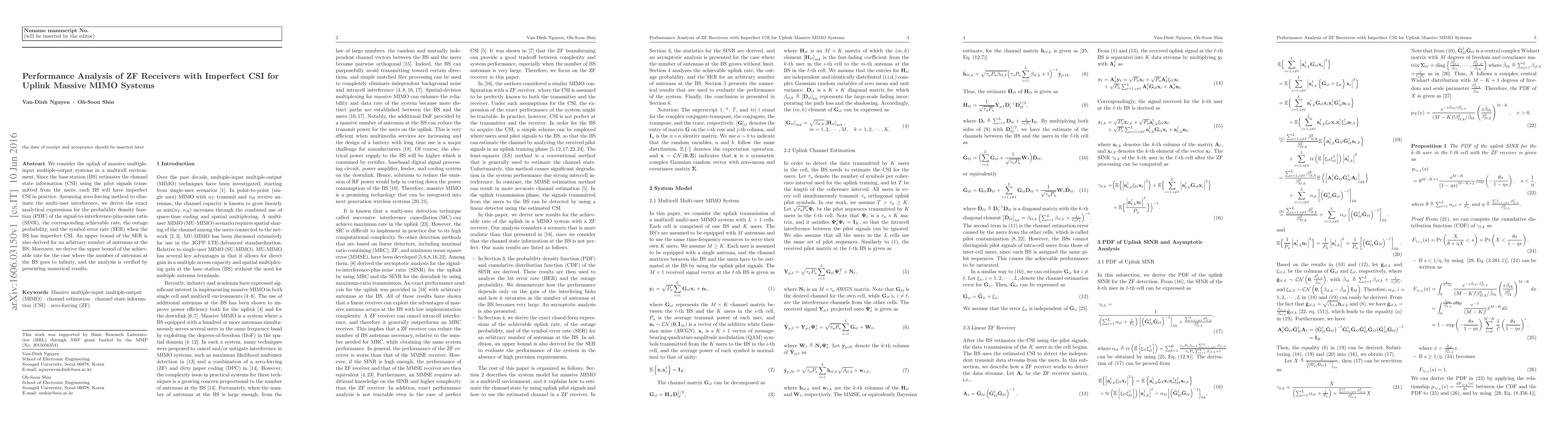 This paper analyzes the performance of zero-forcing receivers in uplink massive MIMO systems under imperfect channel state information (CSI). It derives analytical expressions for SINR, achievable rate, outage probability, and symbol error rate, and provides upper bounds for these metrics, validated by numerical results.