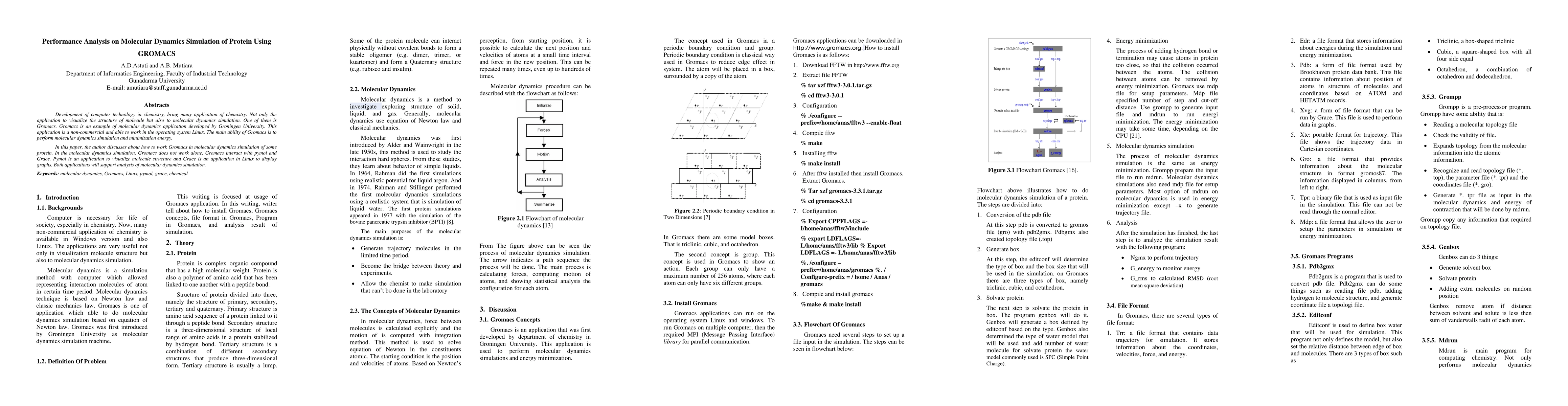 This paper analyzes the performance of GROMACS in simulating protein molecular dynamics, highlighting its integration with Pymol for visualization and Grace for graph display. The study emphasizes GROMACS's capabilities in performing molecular dynamics simulations and energy minimization on proteins.