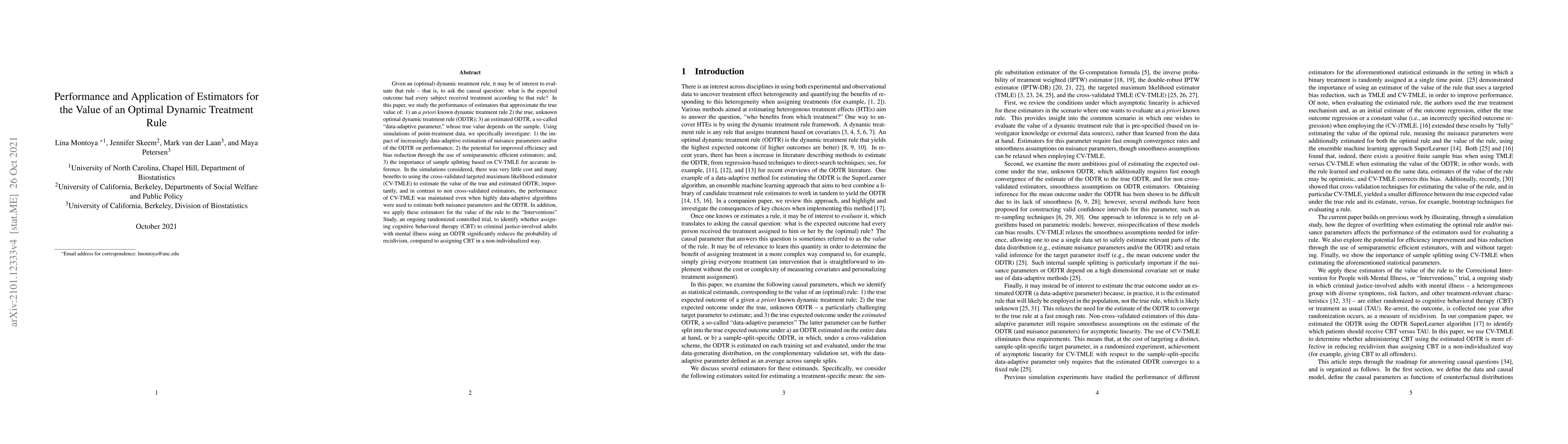 This paper evaluates estimators for the value of optimal dynamic treatment rules, finding that the cross-validated targeted maximum likelihood estimator (CV-TMLE) maintains performance even with highly adaptive algorithms. It also applies these estimators to a study assessing whether individualized cognitive behavioral therapy reduces recidivism in criminal justice-involved adults.