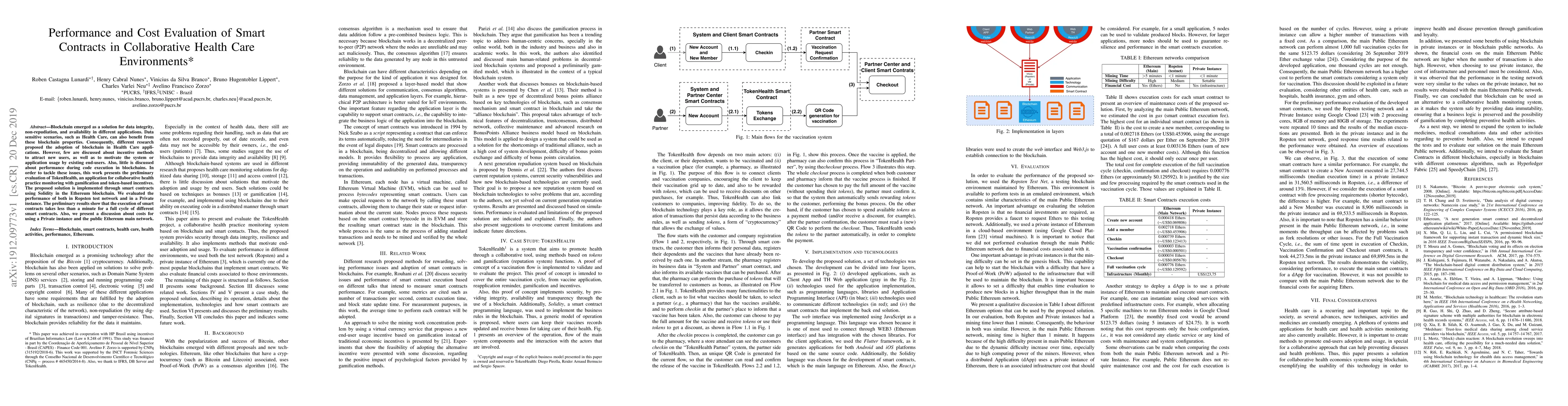 This paper evaluates the performance and cost of smart contracts in a blockchain-based health care monitoring application called TokenHealth, implemented on Ethereum. Preliminary results indicate smart contract execution takes less than a minute, while a cost analysis compares private and public blockchain instances.
