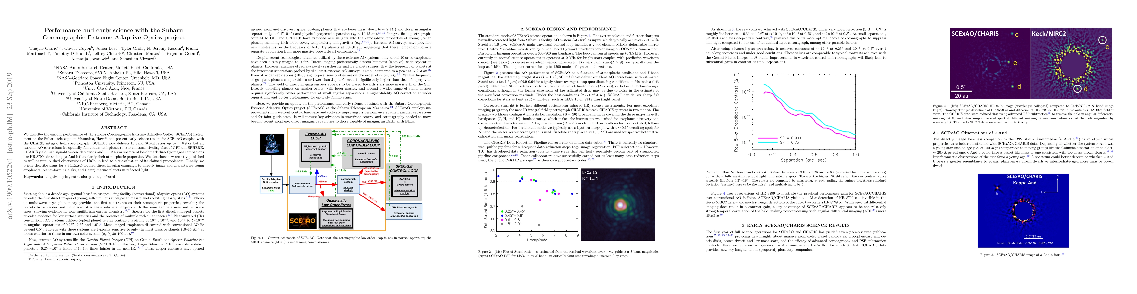 We describe the current performance of the Subaru Coronagraphic Extreme Adaptive Optics (SCExAO) instrument on the Subaru telescope on Maunakea, Hawaii and present early science results for SCExAO coupled with the CHARIS integral field spectrograph. SCExAO now delivers H band Strehl ratios up to $\sim$ 0.9 or better, extreme AO corrections for optically faint stars, and planet-to-star contrasts rivaling that of GPI and SPHERE. CHARIS yield high signal-to-noise detections and 1.1--2.4 $\mu m$ spectra of benchmark directly-imaged companions like HR 8799 cde and kappa And b that clarify their atmospheric properties. We also show how recently published as well as unpublished observations of LkCa 15 lead to a re-evaluation of its claimed protoplanets. Finally, we briefly describe plans for a SCExAO-focused direct imaging campaign to directly image and characterize young exoplanets, planet-forming disks, and (later) mature planets in reflected light.