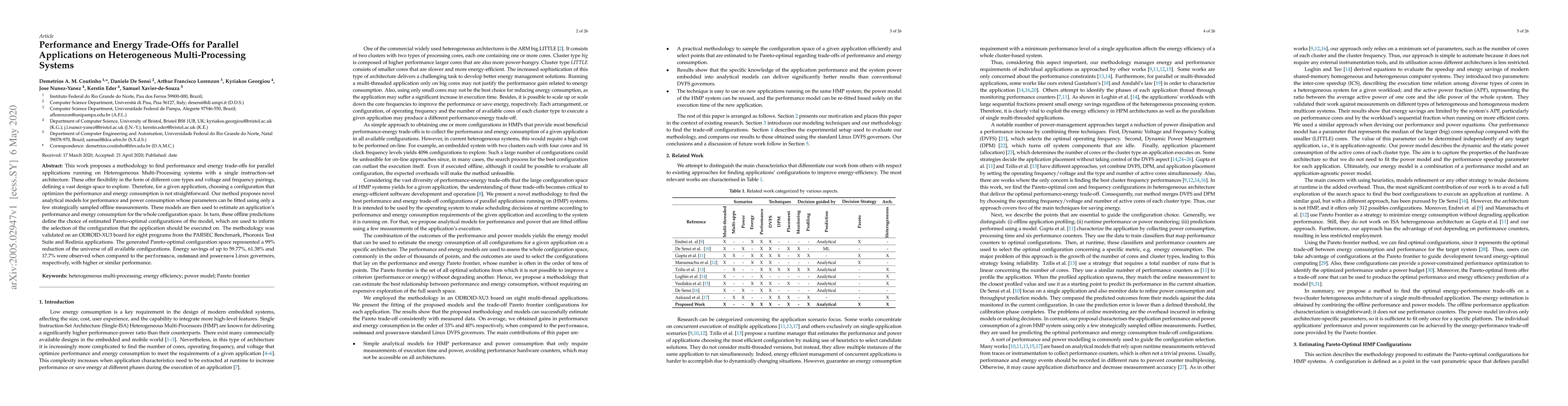 This paper proposes a methodology to optimize performance and energy trade-offs for parallel applications on heterogeneous multi-processing systems using analytical models fitted from offline measurements. The approach reduces the configuration space by 99% and achieves energy savings up to 61.38% while maintaining or improving performance.