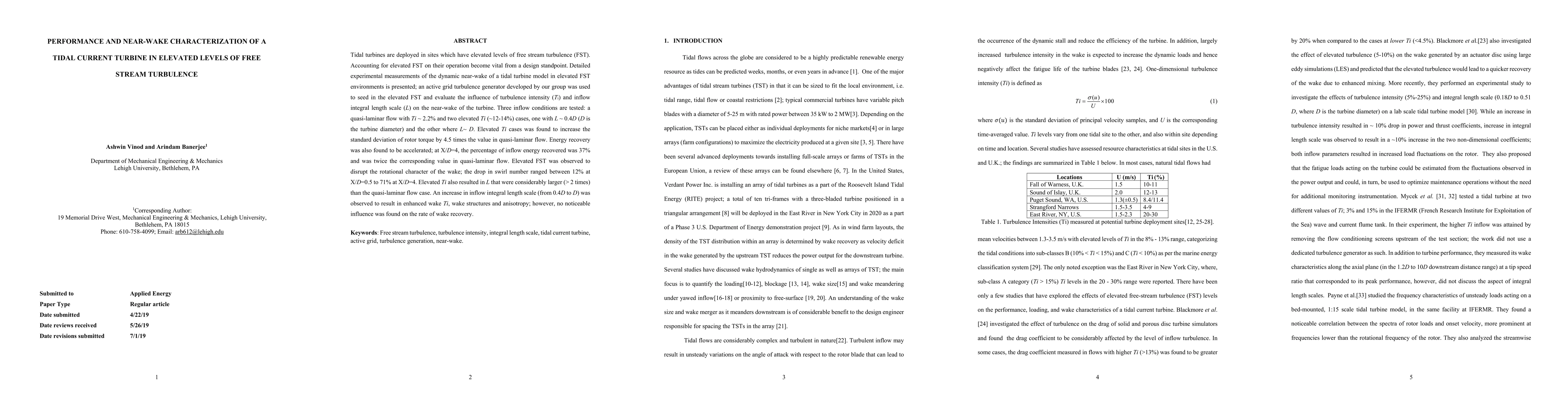A study investigates how elevated free stream turbulence affects a tidal current turbine's performance, finding that it increases energy recovery and disrupts the wake's rotational character.