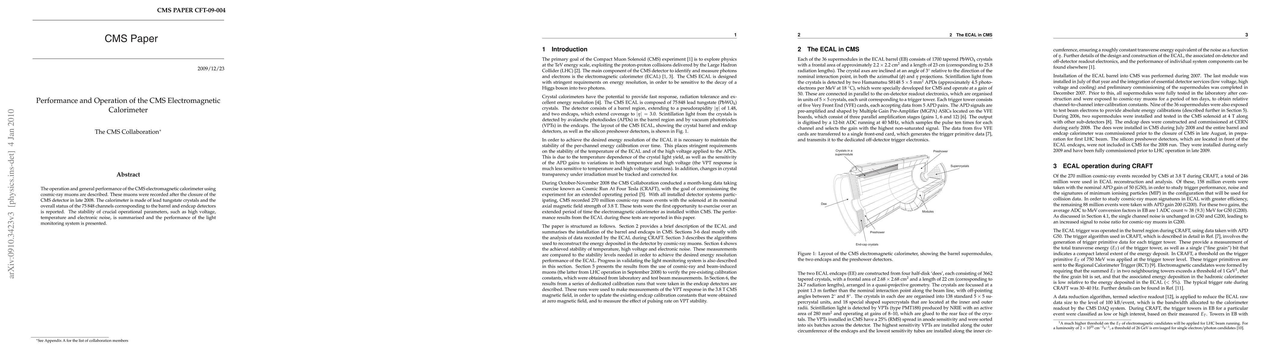 This paper details the operational performance and stability of the CMS electromagnetic calorimeter, utilizing cosmic-ray muons recorded post-closure in 2008. It reports on the status of 75,848 channels and assesses key parameters like high voltage, temperature, and electronic noise, alongside the light monitoring system's effectiveness.