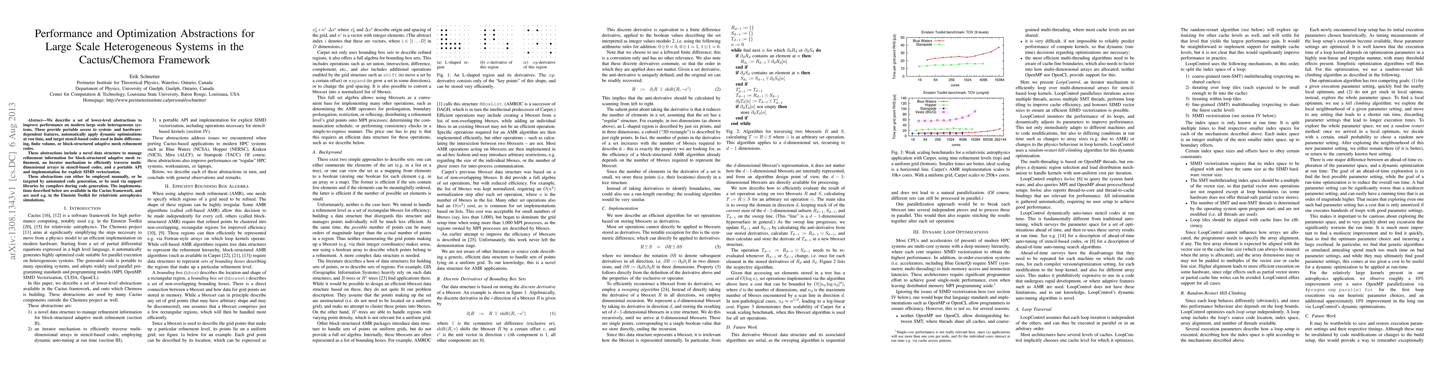 This paper introduces performance optimization abstractions for large scale heterogeneous systems within the Cactus/Chemora framework, focusing on stencil-based codes. It presents portable access to hardware features, dynamic runtime optimizations, and includes a novel data structure for adaptive mesh refinement, an efficient iterator for multi-dimensional arrays, and a SIMD vectorization API.