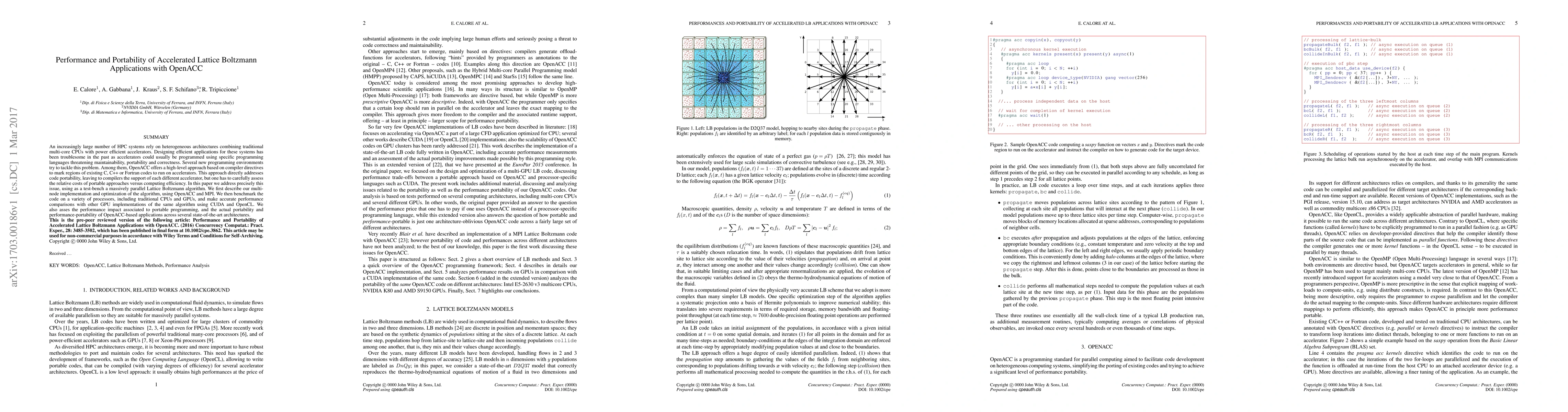 This research investigates the performance and portability of lattice Boltzmann applications accelerated with OpenACC on heterogeneous HPC systems. The study benchmarks a multi-node implementation optimized with OpenACC and MPI across CPUs and GPUs, comparing performance with CUDA and OpenCL implementations to evaluate the trade-off between portable programming and computational efficiency.