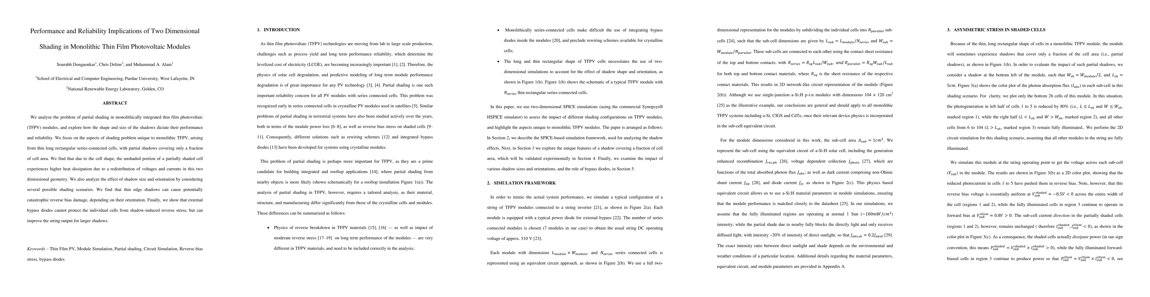 We analyze the problem of partial shading in monolithically integrated thin film photovoltaic (TFPV) modules, and explore how the shape and size of the shadows dictate their performance and reliability. We focus on the aspects of shading problem unique to monolithic TFPV, arising from thin long rectangular series-connected cells, with partial shadows covering only a fraction of cell area. We find that due to the cell shape, the unshaded portion of a partially shaded cell experiences higher heat dissipation due to a redistribution of voltages and currents in this two dimensional geometry. We also analyze the effect of shadow size and orientation by considering several possible shading scenarios. We find that thin edge shadows can cause potentially catastrophic reverse bias damage, depending on their orientation. Finally, we show that external bypass diodes cannot protect the individual cells from shadow-induced reverse stress, but can improve the string output for larger shadows.