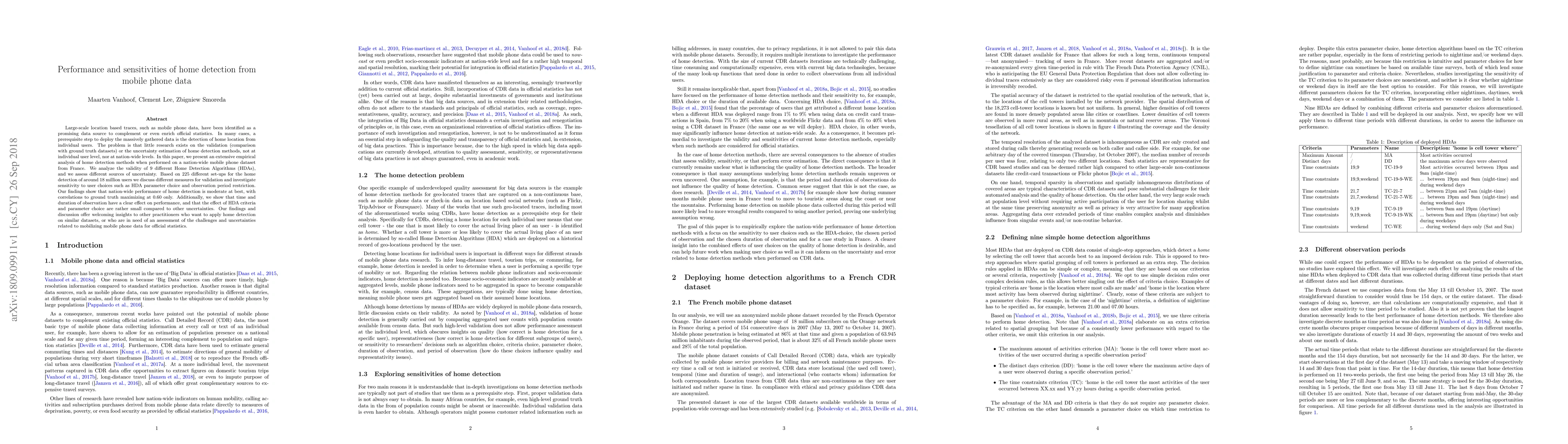 This paper evaluates the performance and uncertainties of nine home detection algorithms using a nationwide mobile phone dataset from France, finding moderate accuracy (correlation up to 0.60) and highlighting significant impacts from observation period and duration, while the effect of algorithm parameters is relatively minor.