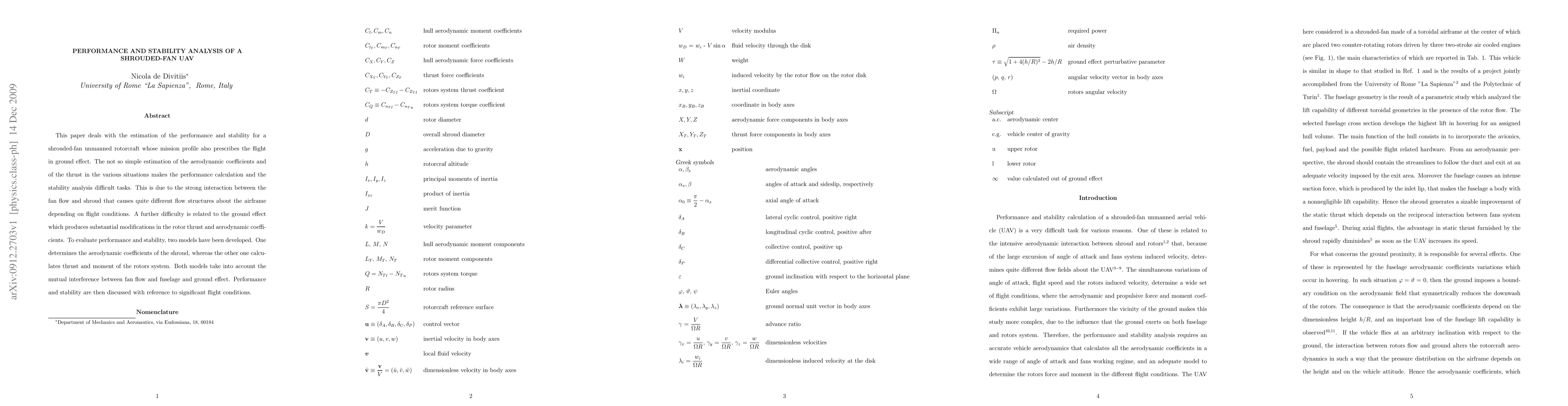 This paper deals with the estimation of the performance and stability for a shrouded-fan unmanned rotorcraft whose mission profile also prescribes the flight in ground effect. The not so simple estimation of the aerodynamic coefficients and of the thrust in the various situations makes the performance calculation and the stability analysis difficult tasks. This is due to the strong interaction between the fan flow and shroud that causes quite different flow structures about the airframe depending on flight conditions. A further difficulty is related to the ground effect which produces substantial modifications in the rotor thrust and aerodynamic coefficients. To evaluate performance and stability, two models have been developed. One determines the aerodynamic coefficients of the shroud, whereas the other one calculates thrust and moment of the rotors system. Both models take into account the mutual interference between fan flow and fuselage and ground effect. Performance and stability are then discussed with reference to significant flight conditions.