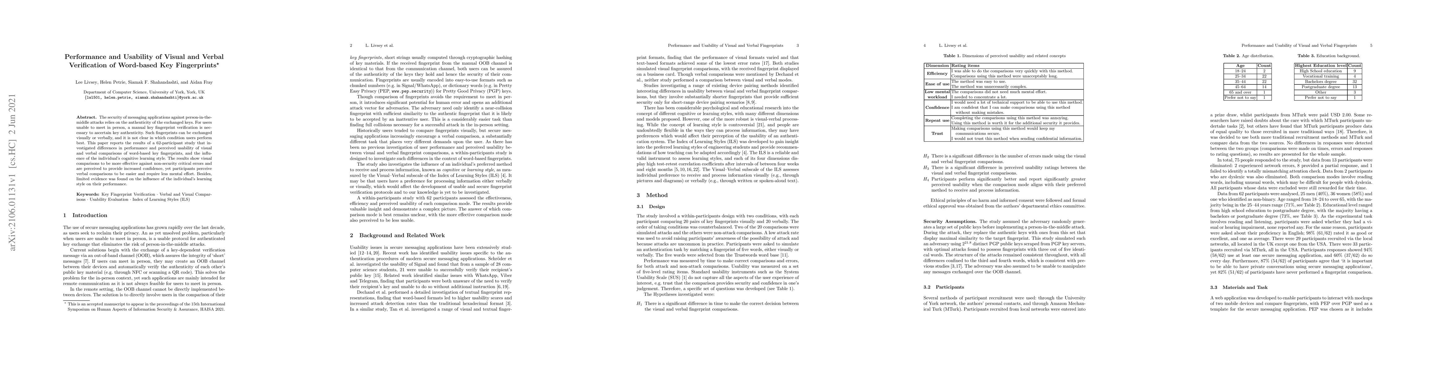 A study found that visual key fingerprint verification is more effective against non-security errors but requires less mental effort than verbal comparison. Participants preferred verbal comparisons due to ease of use, despite seeing no significant impact from individual cognitive learning styles.