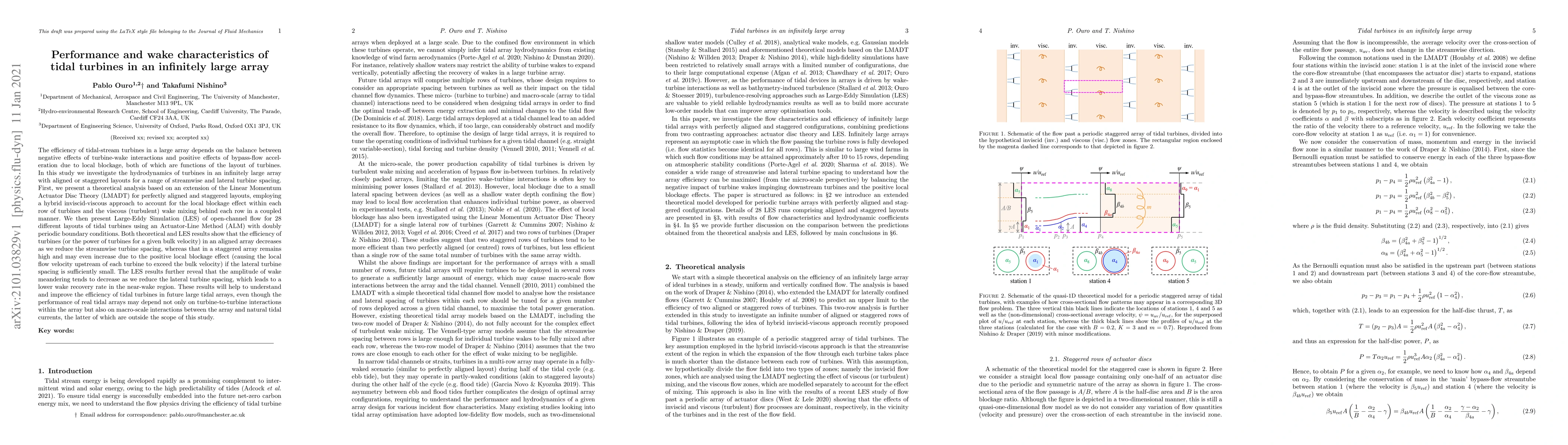 A study investigates the performance of tidal turbines in large arrays with aligned and staggered layouts, finding that efficiency increases in staggered arrays with small lateral spacing due to local blockage effects.