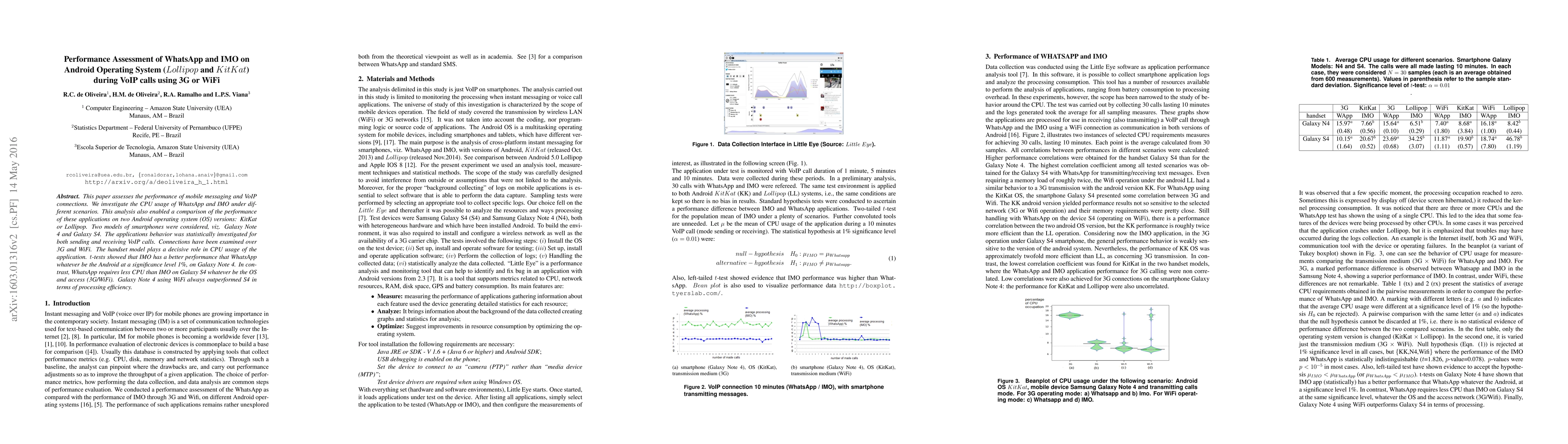 This study compares the performance of WhatsApp and IMO on Android devices (Lollipop and KitKat) during VoIP calls over 3G or WiFi, finding that IMO outperforms WhatsApp on some models but not others.