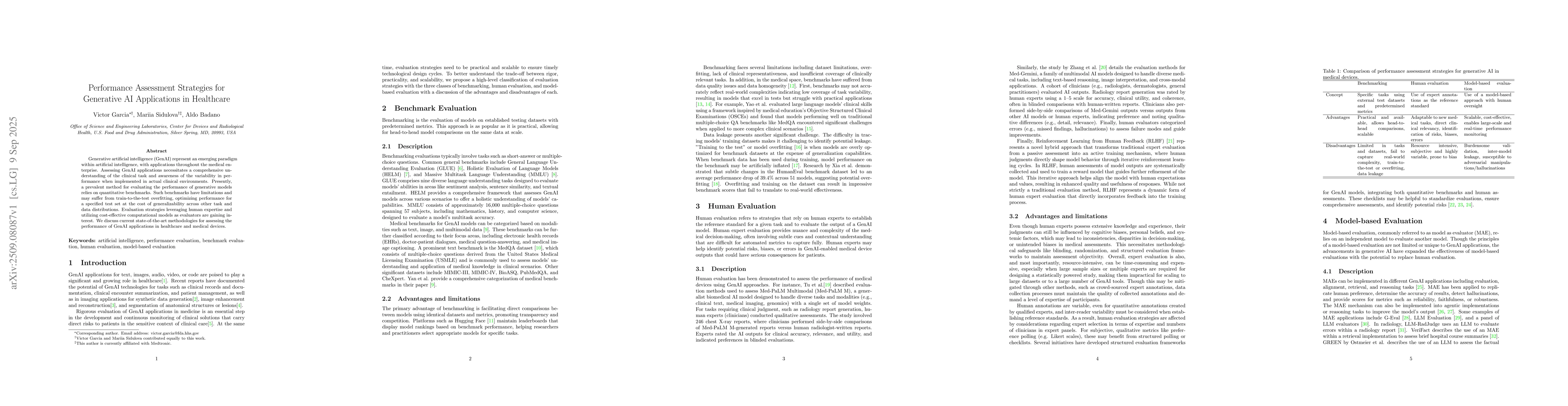 Generative artificial intelligence (GenAI) represent an emerging paradigm within artificial intelligence, with applications throughout the medical enterprise. Assessing GenAI applications necessitates a comprehensive understanding of the clinical task and awareness of the variability in performance when implemented in actual clinical environments. Presently, a prevalent method for evaluating the performance of generative models relies on quantitative benchmarks. Such benchmarks have limitations and may suffer from train-to-the-test overfitting, optimizing performance for a specified test set at the cost of generalizability across other task and data distributions. Evaluation strategies leveraging human expertise and utilizing cost-effective computational models as evaluators are gaining interest. We discuss current state-of-the-art methodologies for assessing the performance of GenAI applications in healthcare and medical devices.