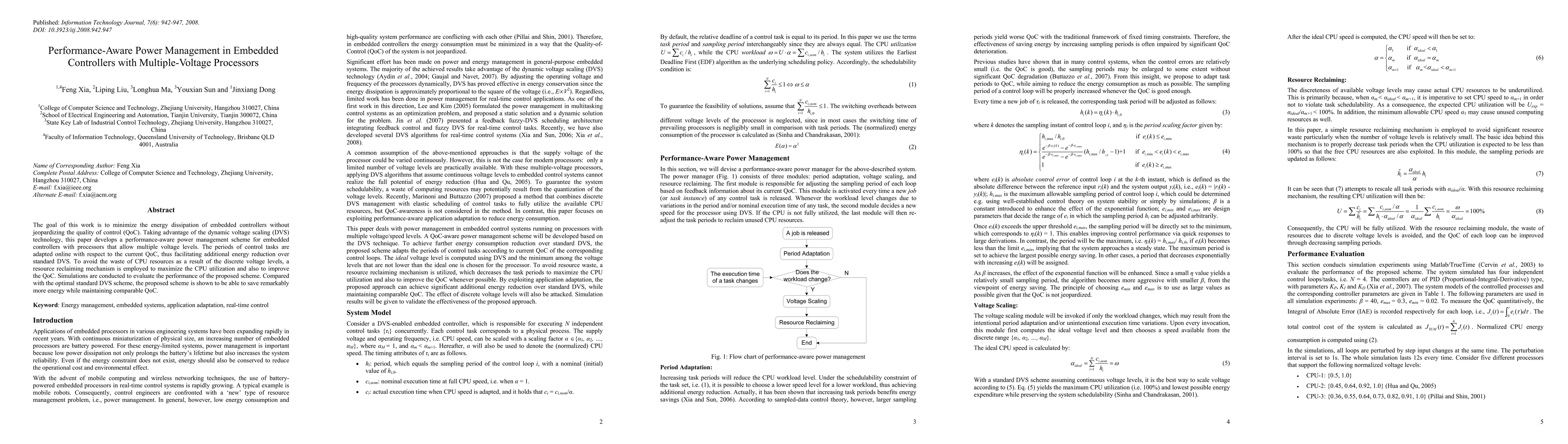 This paper proposes a performance-aware power management scheme for embedded controllers using dynamic voltage scaling (DVS) to minimize energy dissipation while maintaining quality of control. It employs a resource reclaiming mechanism to maximize CPU utilization and improve QoC, achieving significantly more energy savings compared to standard DVS.