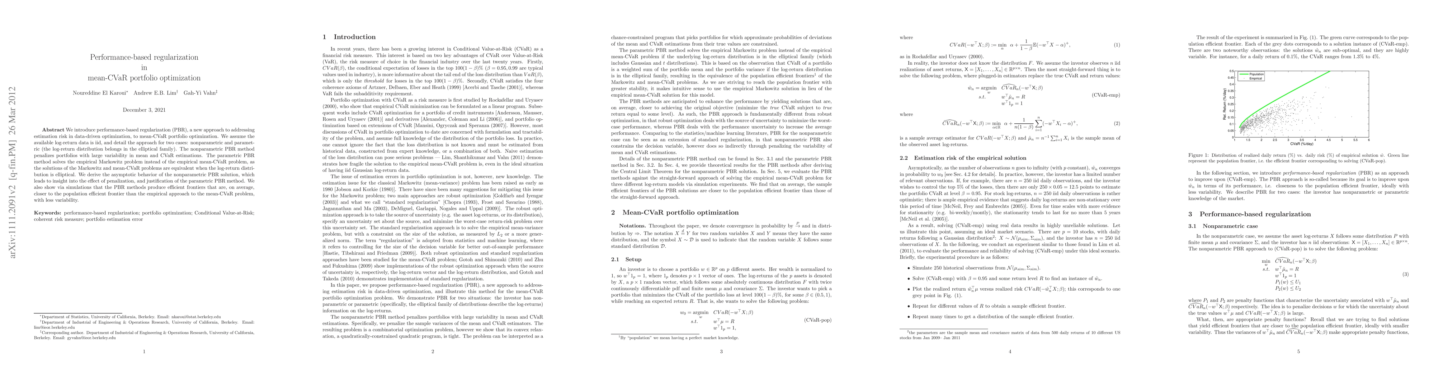 This paper introduces performance-based regularization (PBR) to mitigate estimation risk in mean-CVaR portfolio optimization. It details nonparametric and parametric PBR methods, demonstrating improved efficiency and reduced variability in simulations compared to empirical approaches.