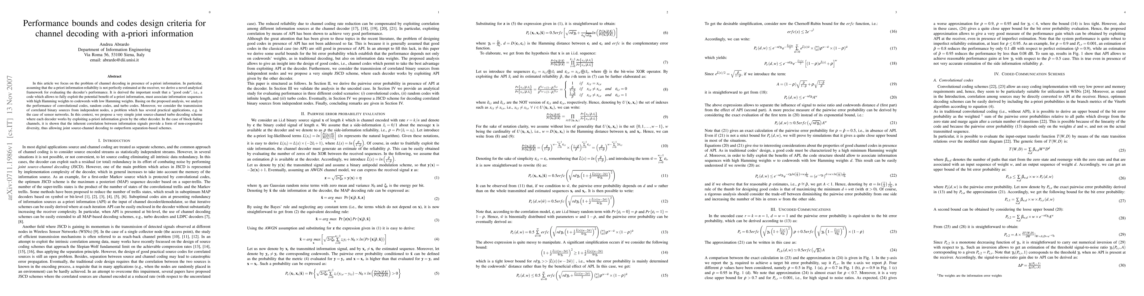 In this article we focus on the problem of channel decoding in presence of a-priori information. In particular, assuming that the a-priori information reliability is not perfectly estimated at the receiver, we derive a novel analytical framework for evaluating the decoder's performance. It is derived the important result that a "good code", i.e., a code which allows to fully exploit the potential benefit of a-priori information, must associate information sequences with high Hamming weights to codewords with low Hamming weights. Basing on the proposed analysis, we analyze the performance of convolutional codes, random codes, and turbo codes. Moreover, we consider the transmission of correlated binary sources from independent nodes, a problem which has several practical applications, e.g. in the case of sensor networks. In this context, we propose a very simple joint source-channel turbo decoding scheme where each decoder works by exploiting a-priori information given by the other decoder. In the case of block fading channels, it is shown that the inherent correlation between information signals provide a form of non-cooperative diversity, thus allowing joint source-channel decoding to outperform separation-based schemes.