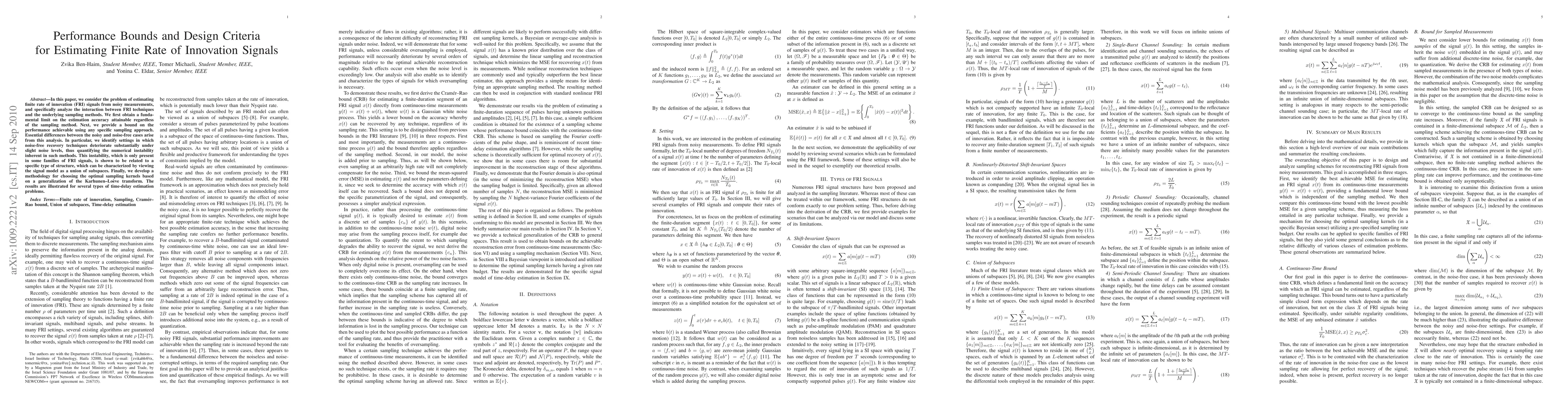 This paper establishes fundamental limits on the accuracy of estimating finite rate of innovation signals from noisy measurements, and provides a performance bound for various sampling methods. It identifies numerical instability in noise-free recovery techniques under slight noise and proposes an optimal sampling kernel selection methodology based on a generalized Karhunen-Loève transform.