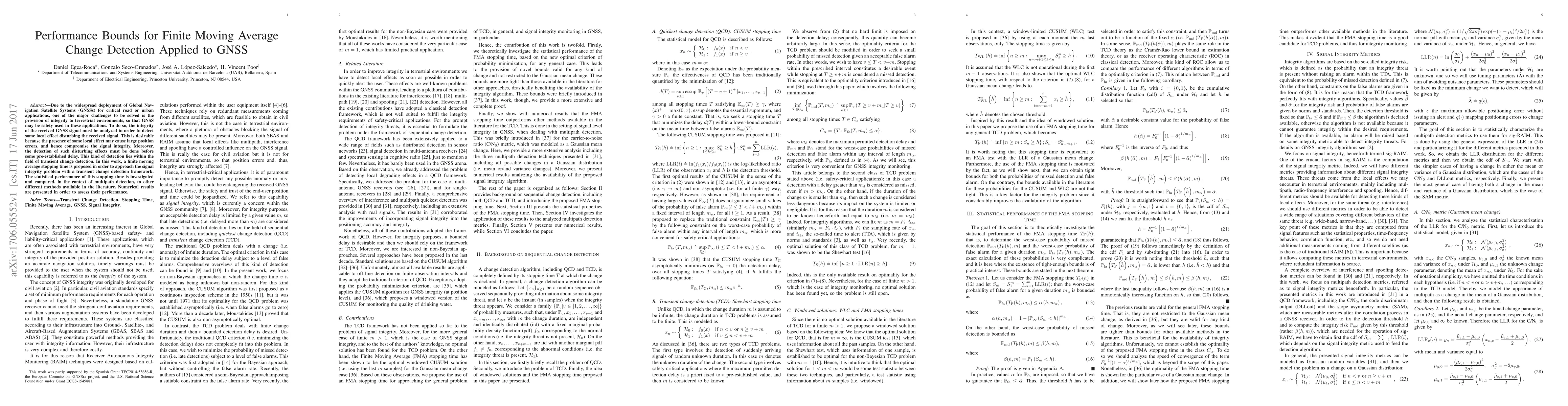 Due to the widespread deployment of Global Navigation Satellite Systems (GNSSs) for critical road or urban applications, one of the major challenges to be solved is the provision of integrity to terrestrial environments, so that GNSS may be safety used in these applications. To do so, the integrity of the received GNSS signal must be analyzed in order to detect some local effect disturbing the received signal. This is desirable because the presence of some local effect may cause large position errors, and hence compromise the signal integrity. Moreover, the detection of such disturbing effects must be done before some pre-established delay. This kind of detection lies within the field of transient change detection. In this work, a finite moving average stopping time is proposed in order to approach the signal integrity problem with a transient change detection framework. The statistical performance of this stopping time is investigated and compared, in the context of multipath detection, to other different methods available in the literature. Numerical results are presented in order to assess their performance.