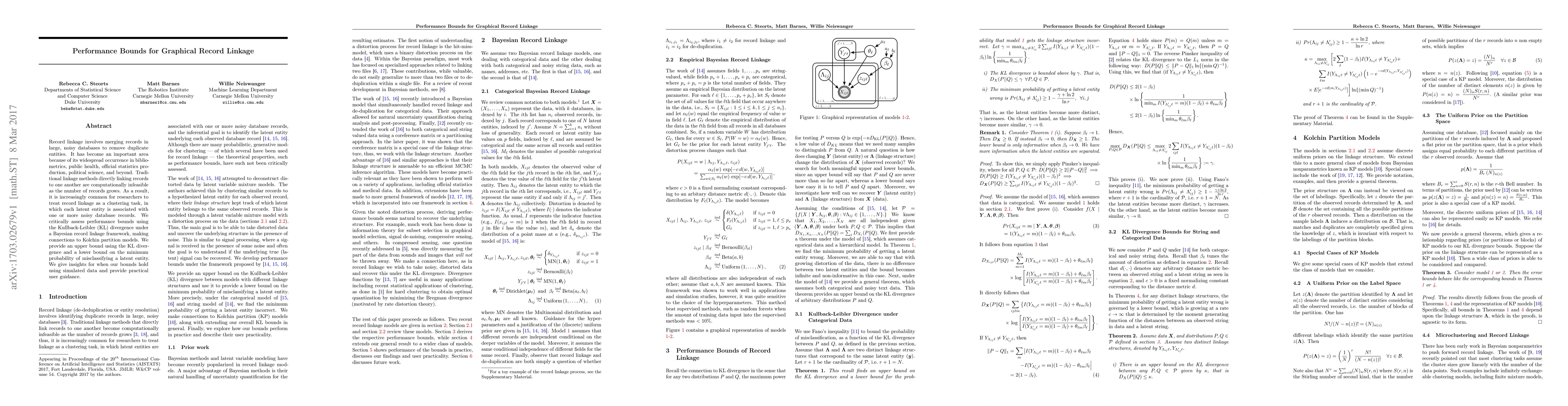 This paper evaluates performance bounds for graphical record linkage, employing Kullback-Leibler divergence within a Bayesian framework. It establishes an upper bound and a lower bound on misclassification probability, offering insights and practical guidance for when these bounds are applicable.