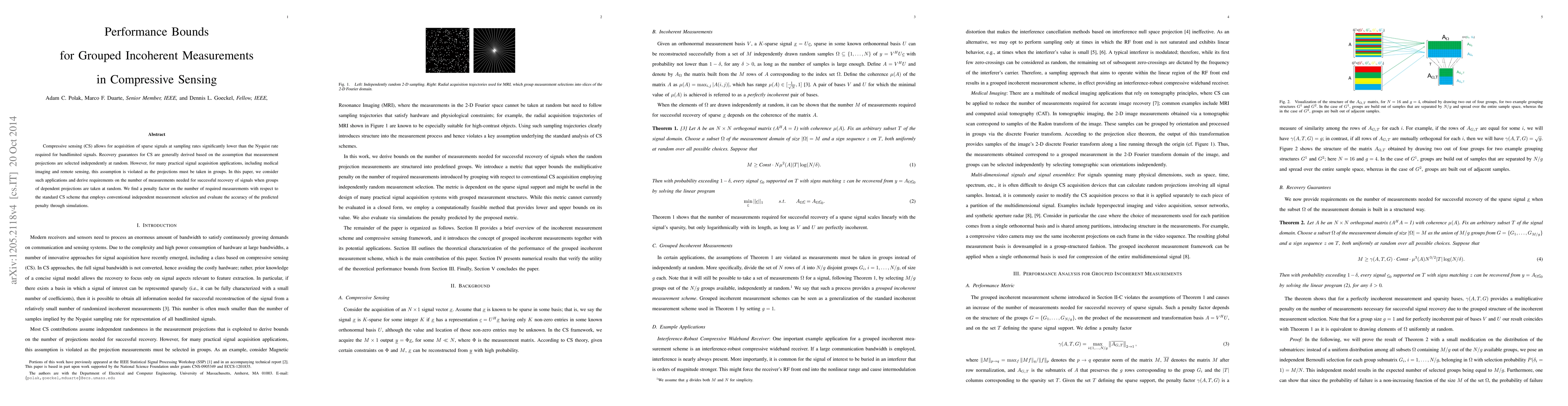 The paper derives performance bounds for group incoherent measurements in compressive sensing, finding that groups of dependent projections require more measurements than independent selections for successful recovery.