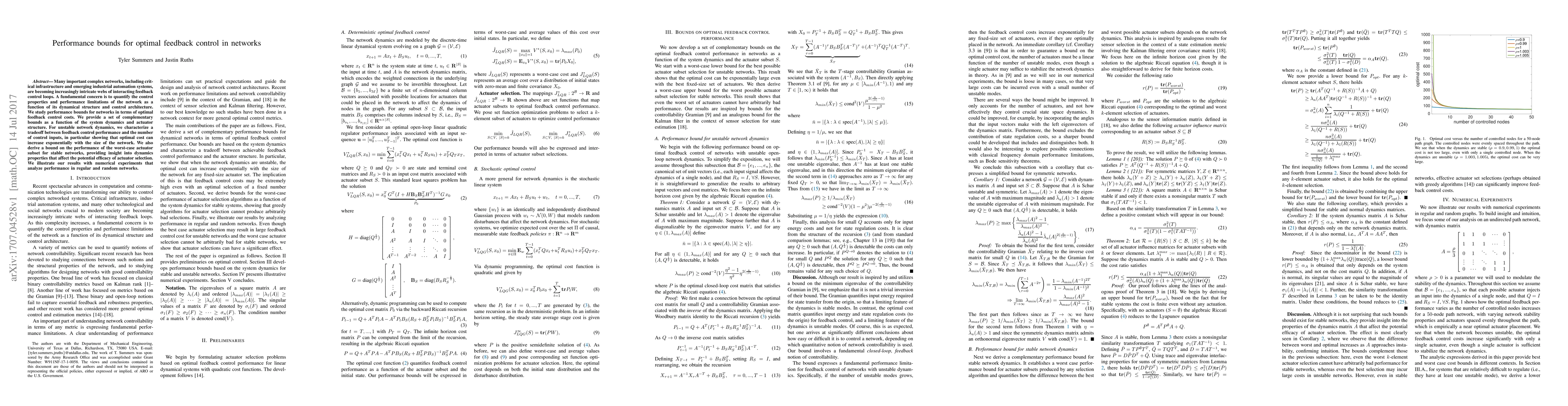 This paper investigates performance bounds for optimal feedback control in complex networks, providing complementary bounds based on system dynamics and actuator structure. It reveals an exponential increase in optimal cost with network size for unstable dynamics and offers insights into actuator selection efficacy for stable networks.