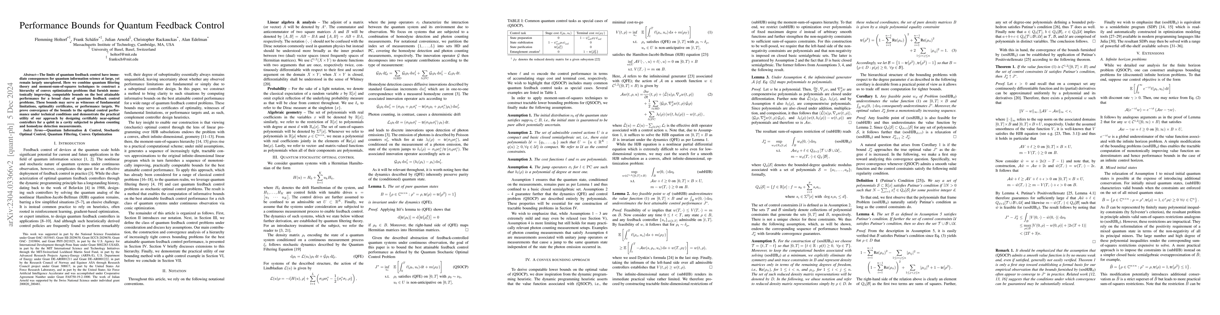 Quantum feedback controllers often lack performance targets and optimality certificates. We combine quantum filtering theory and moment-sum-of-squares techniques to construct a hierarchy of convex optimization problems that furnish monotonically improving, computable bounds on the best attainable performance for a large class of quantum feedback control problems. We prove convergence of the bounds under technical assumptions and demonstrate the practical utility of our approach by designing certifiably near-optimal controllers for a qubit in a cavity subjected to continuous photon counting and homodyne detection measurements.