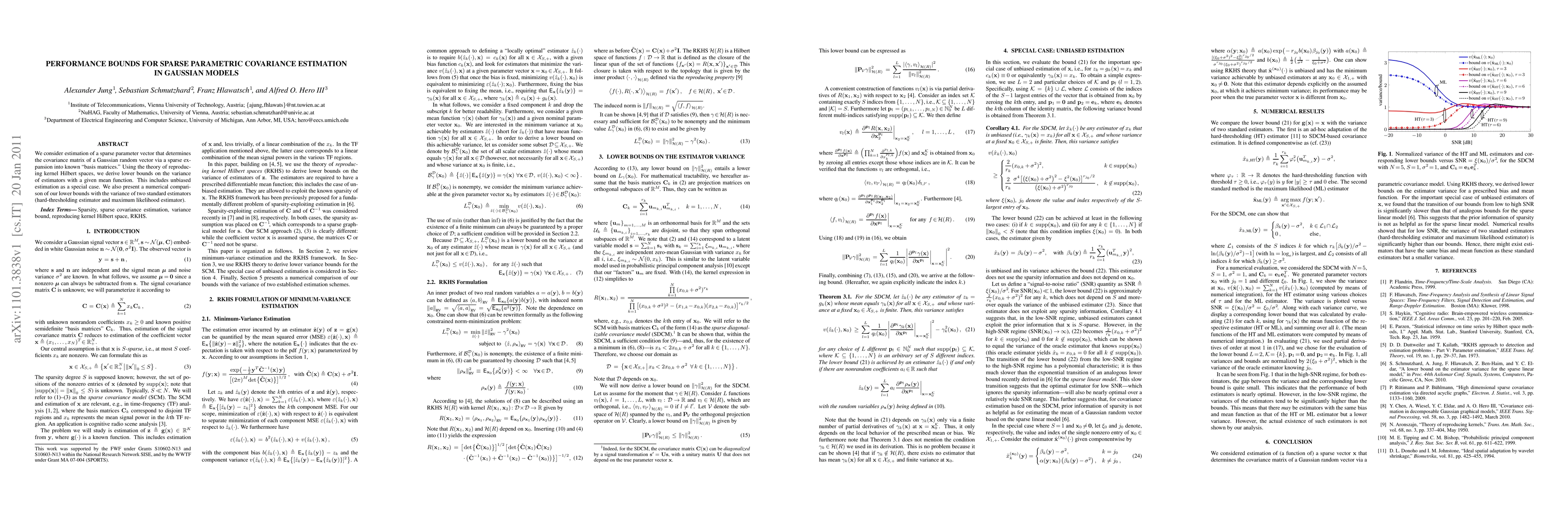 This paper derives lower bounds for the variance of estimators in sparse parametric covariance estimation for Gaussian models, using reproducing kernel Hilbert spaces. It also compares these bounds with the variances of two standard estimators: the hard-thresholding estimator and the maximum likelihood estimator.