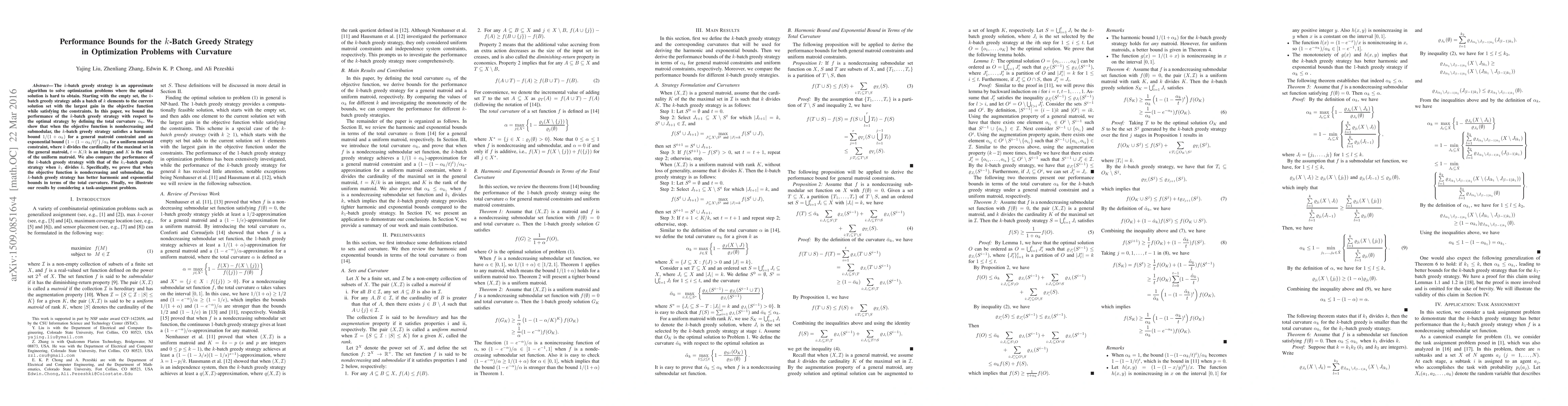The k-batch greedy strategy is analyzed for its performance bounds in optimization problems with curvature, showing harmonic and exponential bounds that depend on the total curvature of the objective function.