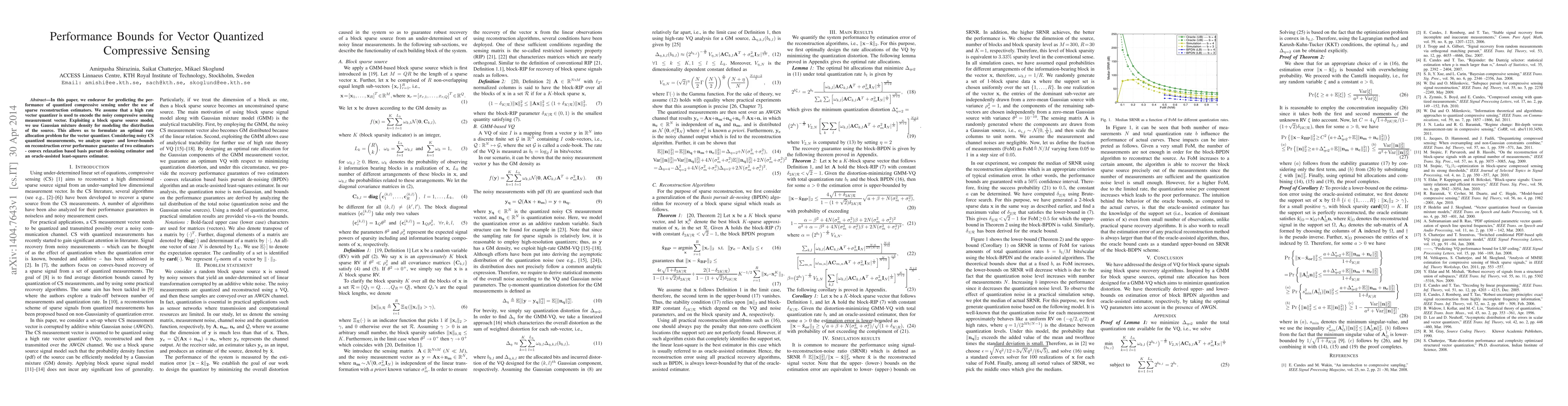 This paper investigates performance bounds for vector quantized compressive sensing using sparse reconstruction estimators, focusing on optimal rate allocation for high-rate vector quantization. It analyzes upper and lower bounds on reconstruction error for two estimators: a convex relaxation basis pursuit de-noising estimator and an oracle-assisted least-squares estimator.