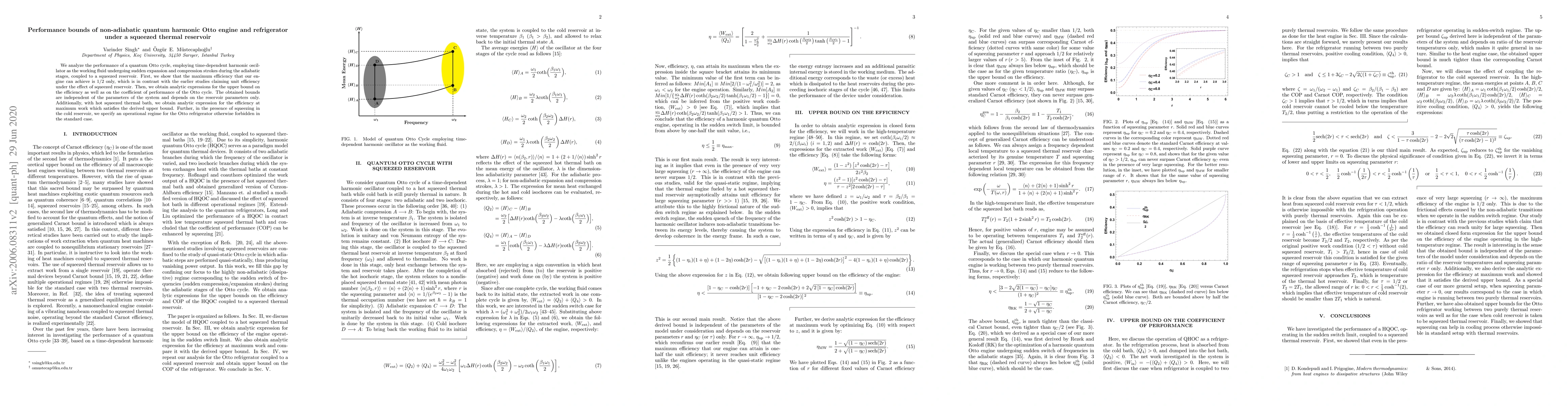 This paper investigates the performance of a quantum Otto cycle with a time-dependent harmonic oscillator, coupled to a squeezed thermal reservoir, finding that maximum efficiency is 1/2, contrary to previous claims of unit efficiency. It derives analytic expressions for the upper bounds on efficiency and performance, which depend solely on reservoir parameters.