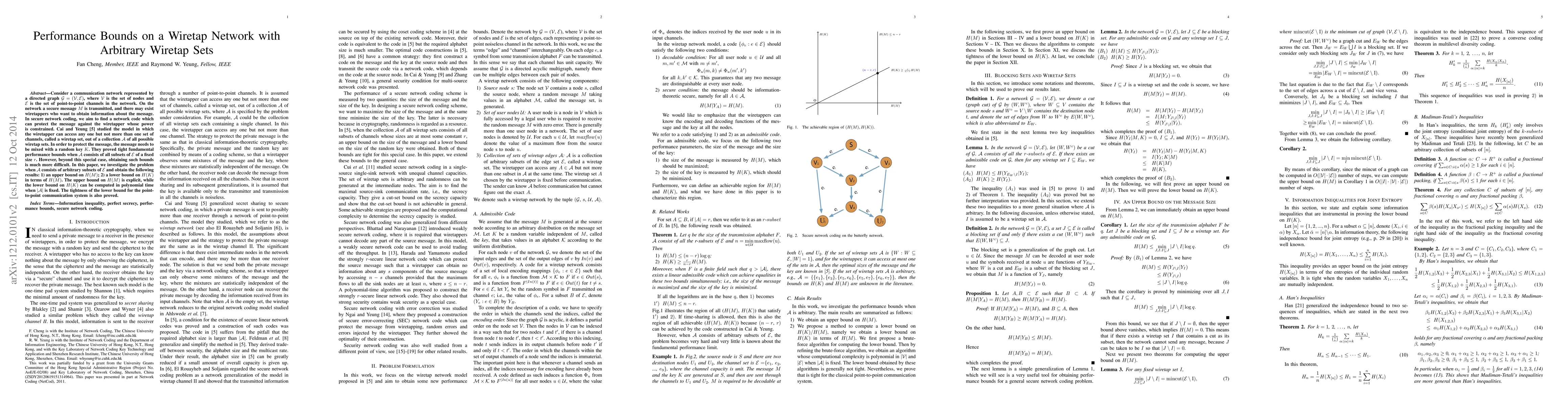 Consider a communication network represented by a directed graph $\mathcal{G}=(\mathcal{V},\mathcal{E})$, where $\mathcal{V}$ is the set of nodes and $\mathcal{E}$ is the set of point-to-point channels in the network. On the network a secure message $M$ is transmitted, and there may exist wiretappers who want to obtain information about the message. In secure network coding, we aim to find a network code which can protect the message against the wiretapper whose power is constrained. Cai and Yeung \cite{cai2002secure} studied the model in which the wiretapper can access any one but not more than one set of channels, called a wiretap set, out of a collection $\mathcal{A}$ of all possible wiretap sets. In order to protect the message, the message needs to be mixed with a random key $K$. They proved tight fundamental performance bounds when $\mathcal{A}$ consists of all subsets of $\mathcal{E}$ of a fixed size $r$. However, beyond this special case, obtaining such bounds is much more difficult. In this paper, we investigate the problem when $\mathcal{A}$ consists of arbitrary subsets of $\mathcal{E}$ and obtain the following results: 1) an upper bound on $H(M)$; 2) a lower bound on $H(K)$ in terms of $H(M)$. The upper bound on $H(M)$ is explicit, while the lower bound on $H(K)$ can be computed in polynomial time when $|\mathcal{A}|$ is fixed. The tightness of the lower bound for the point-to-point communication system is also proved.