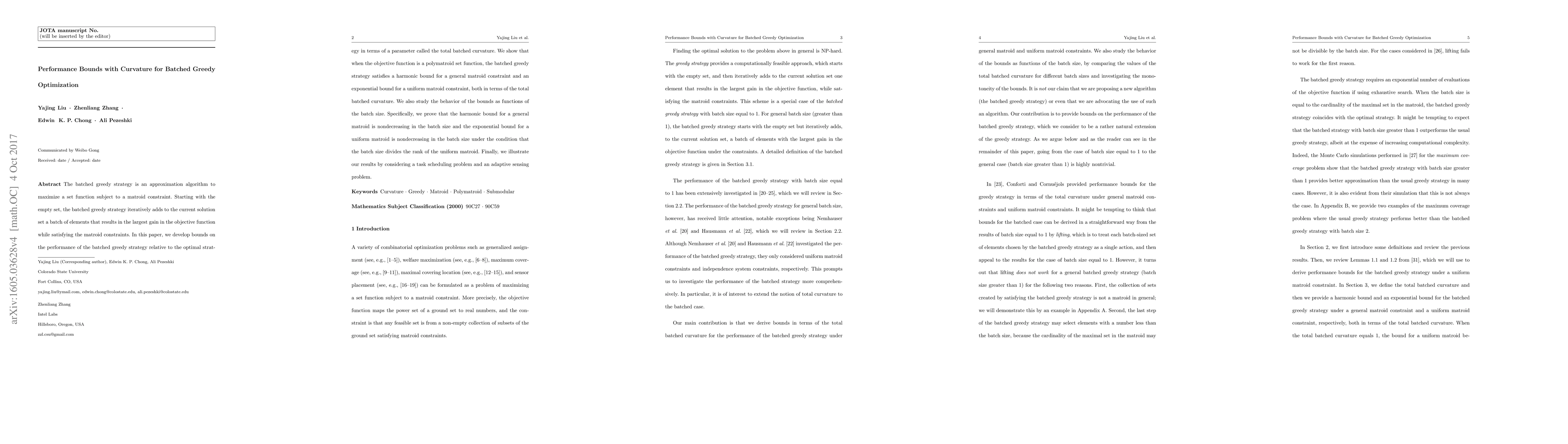 The batched greedy strategy is an approximation algorithm to maximize a set function subject to a matroid constraint. Starting with the empty set, the batched greedy strategy iteratively adds to the current solution set a batch of elements that results in the largest gain in the objective function while satisfying the matroid constraints. In this paper, we develop bounds on the performance of the batched greedy strategy relative to the optimal strategy in terms of a parameter called the total batched curvature. We show that when the objective function is a polymatroid set function, the batched greedy strategy satisfies a harmonic bound for a general matroid constraint and an exponential bound for a uniform matroid constraint, both in terms of the total batched curvature. We also study the behavior of the bounds as functions of the batch size. Specifically, we prove that the harmonic bound for a general matroid is nondecreasing in the batch size and the exponential bound for a uniform matroid is nondecreasing in the batch size under the condition that the batch size divides the rank of the uniform matroid. Finally, we illustrate our results by considering a task scheduling problem and an adaptive sensing problem.