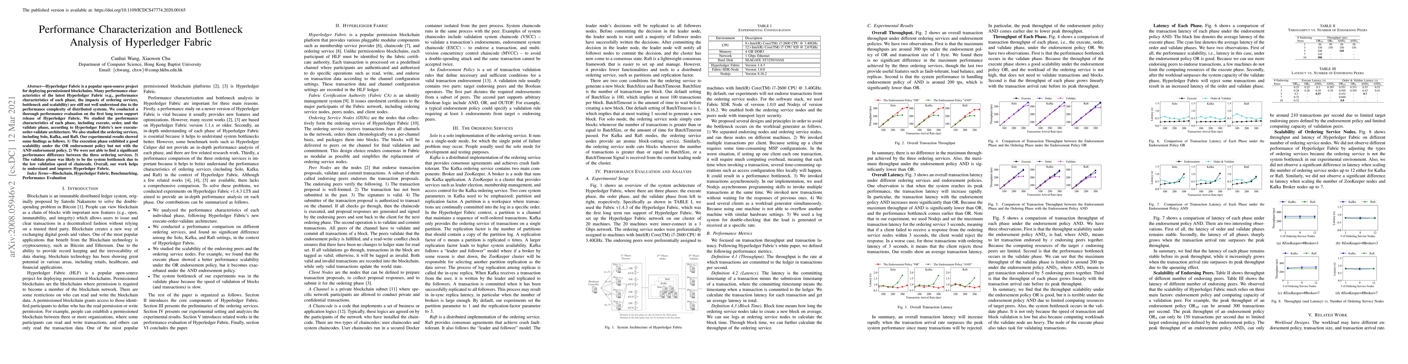 This paper conducts a comprehensive performance evaluation of Hyperledger Fabric, focusing on its scalability and bottlenecks. Key findings include good scalability in the execution phase under the OR endorsement policy, negligible performance differences among Solo, Kafka, and Raft ordering services, and the validate phase being the main bottleneck due to slow chaincode validation.