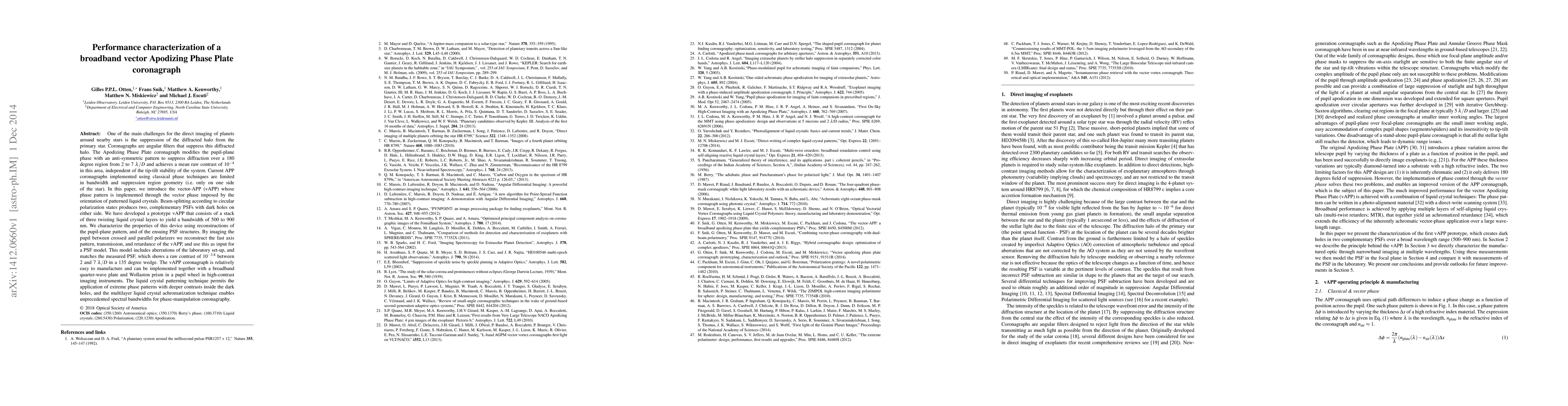 The research characterizes a prototype of the Vector Apodizing Phase Plate (vAPP) coronagraph using liquid crystal technology, measuring its phase pattern, retardance, and transmission across a broadband wavelength range of 500-900 nm.