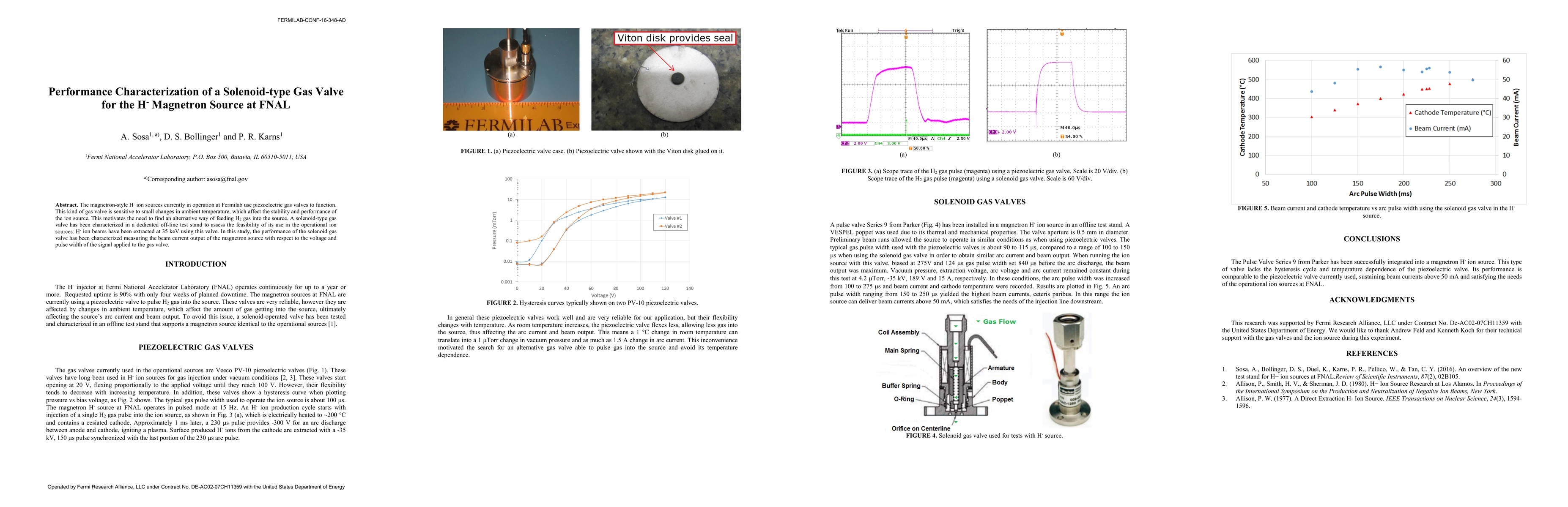 Researchers tested a solenoid-type gas valve for its performance in an H$^{-}$ magnetron source at Fermilab, finding it stable and effective at 35 keV beam current output.