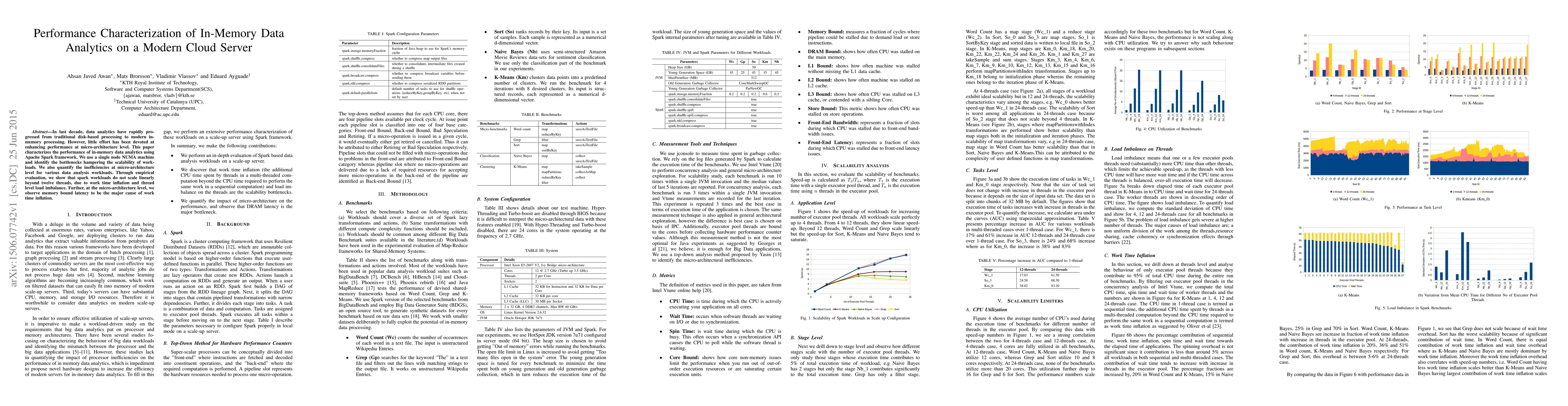 This paper characterizes the performance of in-memory data analytics on a modern cloud server using Apache Spark, identifying bottlenecks and inefficiencies at the micro-architecture level. Empirical evaluation reveals that Spark workloads do not scale linearly beyond twelve threads due to work time inflation and thread level load imbalance, primarily caused by memory bound latency.