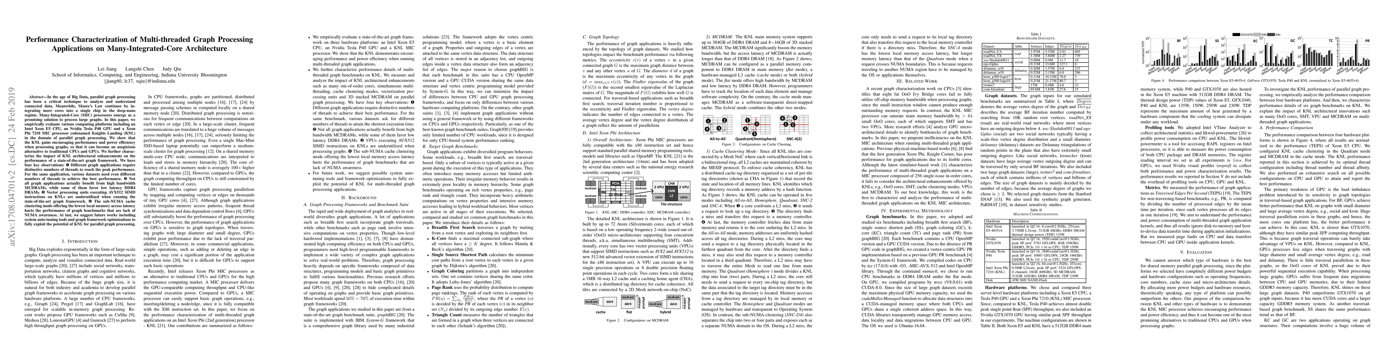 This paper evaluates the performance of multi-threaded graph processing applications on Intel Xeon Phi 7210 (KNL) compared to Intel Xeon E5 CPU and Nvidia Geforce GTX1070 GPU. The study finds that KNL shows promising performance for graph processing, with key insights highlighting the need for tailored thread counts, the varying benefits of MCDRAM vs. DDR4 DRAM, underutilized vector processing units, and the negative impact of sub-NUMA cache clustering on performance.