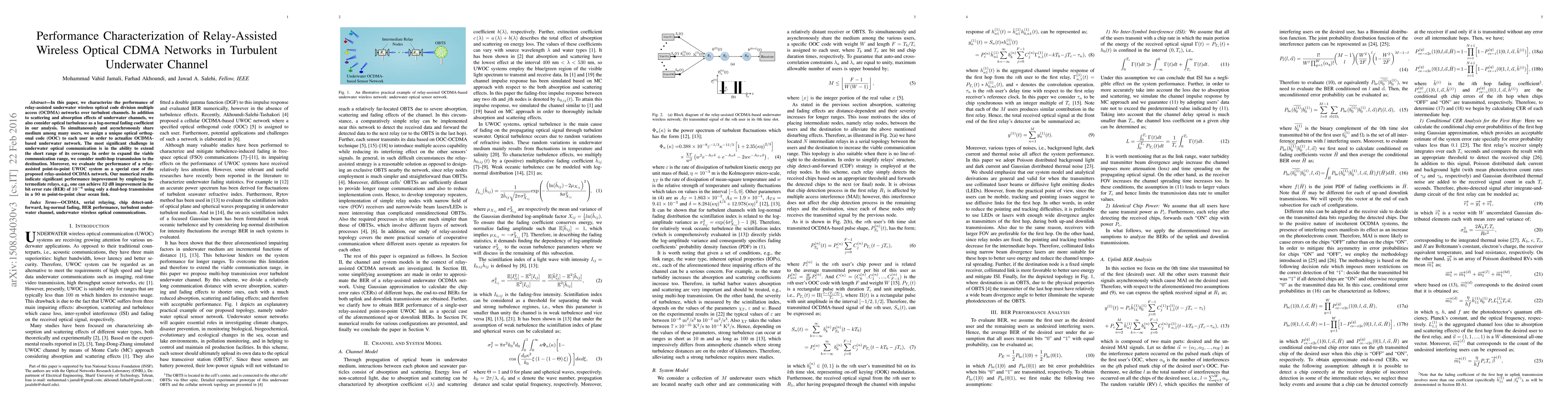 This paper characterizes the performance of relay-assisted underwater wireless optical CDMA networks, considering scattering, absorption, and optical turbulence. It demonstrates significant performance improvements, such as a $32$ dB BER reduction using dual-hop relay transmission in a $90$ m underwater link.