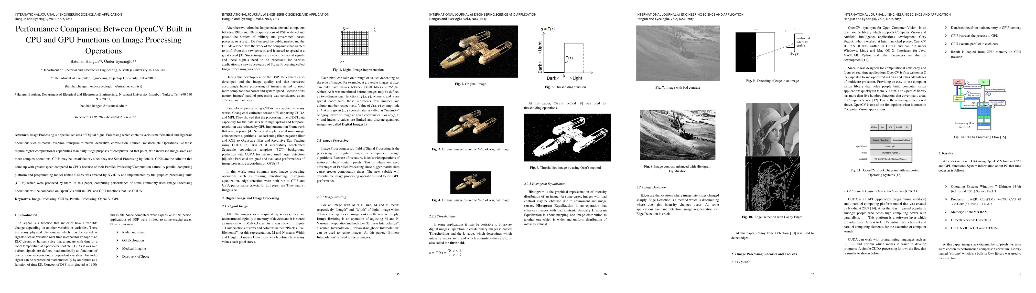 Image Processing is a specialized area of Digital Signal Processing which contains various mathematical and algebraic operations such as matrix inversion, transpose of matrix, derivative, convolution, Fourier Transform etc. Operations like those require higher computational capabilities than daily usage purposes of computers. At that point, with increased image sizes and more complex operations, CPUs may be unsatisfactory since they use Serial Processing by default. GPUs are the solution that come up with greater speed compared to CPUs because of their Parallel Processing/Computation nature. A parallel computing platform and programming model named CUDA was created by NVIDIA and implemented by the graphics processing units (GPUs) which were produced by them. In this paper, computing performance of some commonly used Image Processing operations will be compared on OpenCV's built in CPU and GPU functions that use CUDA.