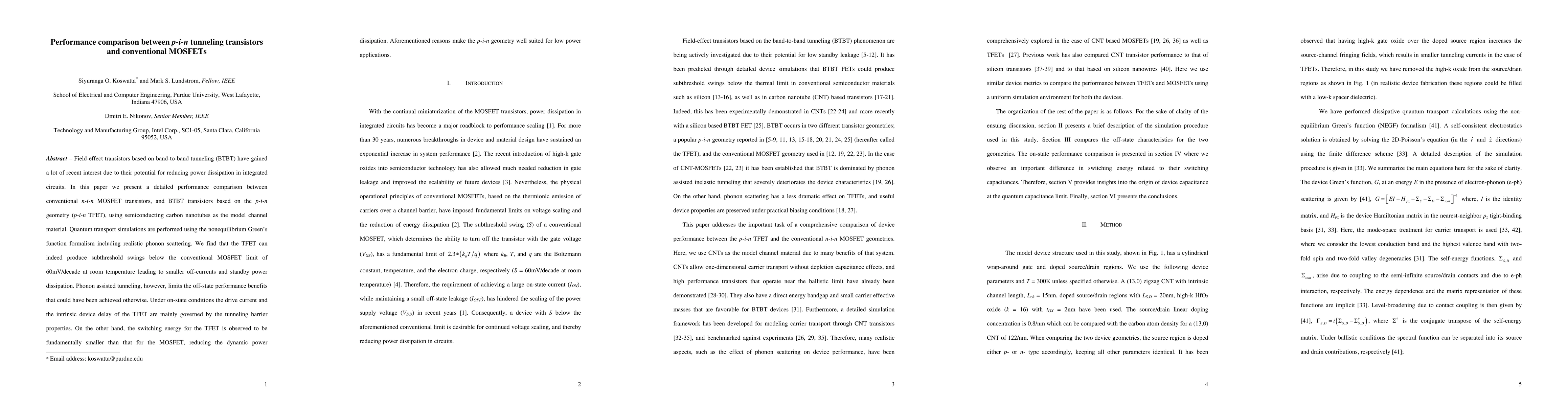This paper compares the performance of p-i-n tunneling transistors (TFET) to conventional MOSFETs, finding that TFETs can achieve subthreshold swings below the MOSFET limit, leading to lower off-currents and standby power dissipation, though phonon scattering limits these benefits. The TFET's switching energy is also fundamentally lower, making it suitable for low-power applications.