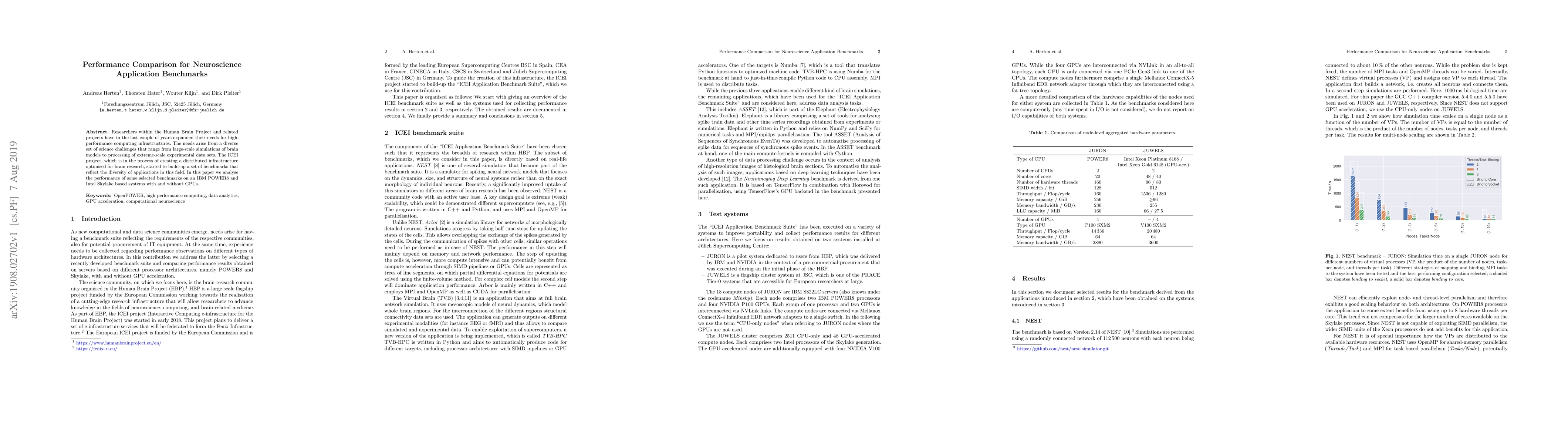 A study compares the performance of various benchmarks for neuroscience applications on different computer systems, including IBM POWER8 and Intel Skylake with and without GPUs.