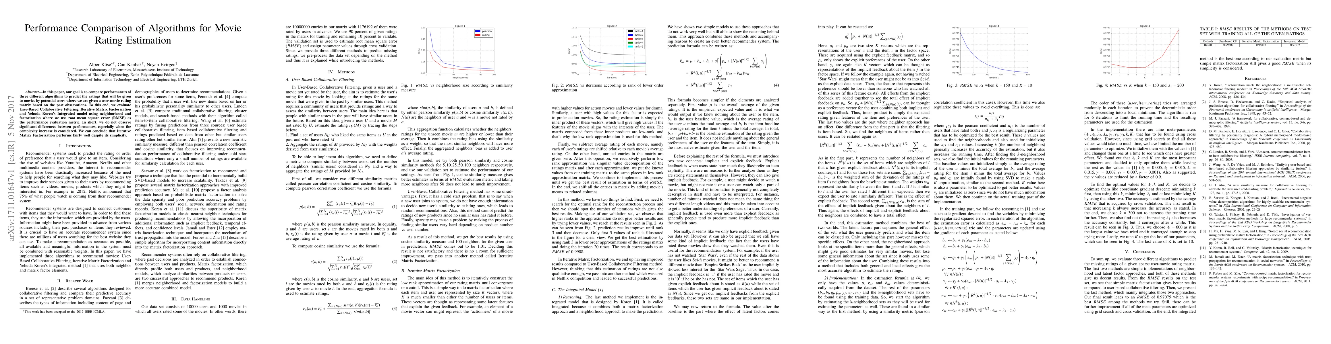 This paper compares three algorithms for predicting movie ratings: User-Based Collaborative Filtering, Iterative Matrix Factorization, and Yehuda Koren's Integrated model. The study concludes that Iterative Matrix Factorization performs fairly well despite its simplicity.