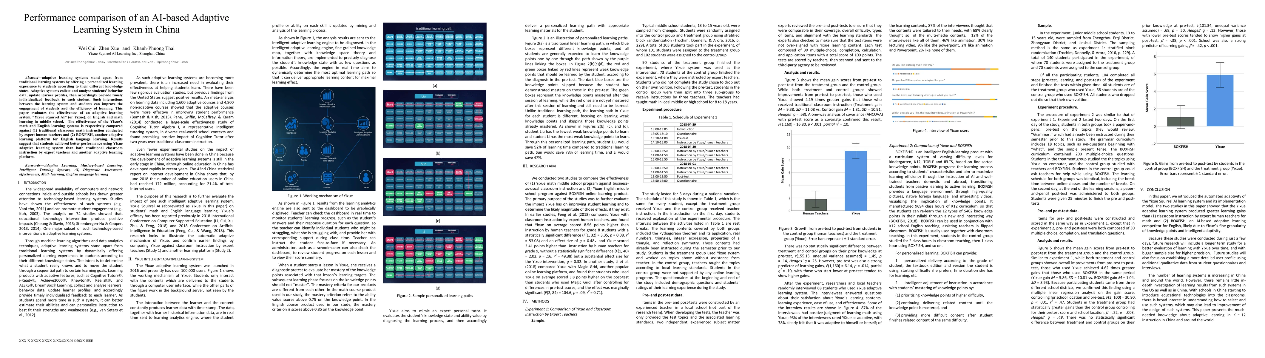This paper evaluates the effectiveness of the AI-based adaptive learning system "Yixue Squirrel AI" (Yixue) in improving middle school students' English and math performance. Results show that Yixue outperforms both traditional classroom instruction and another adaptive learning platform, BOXFiSH.