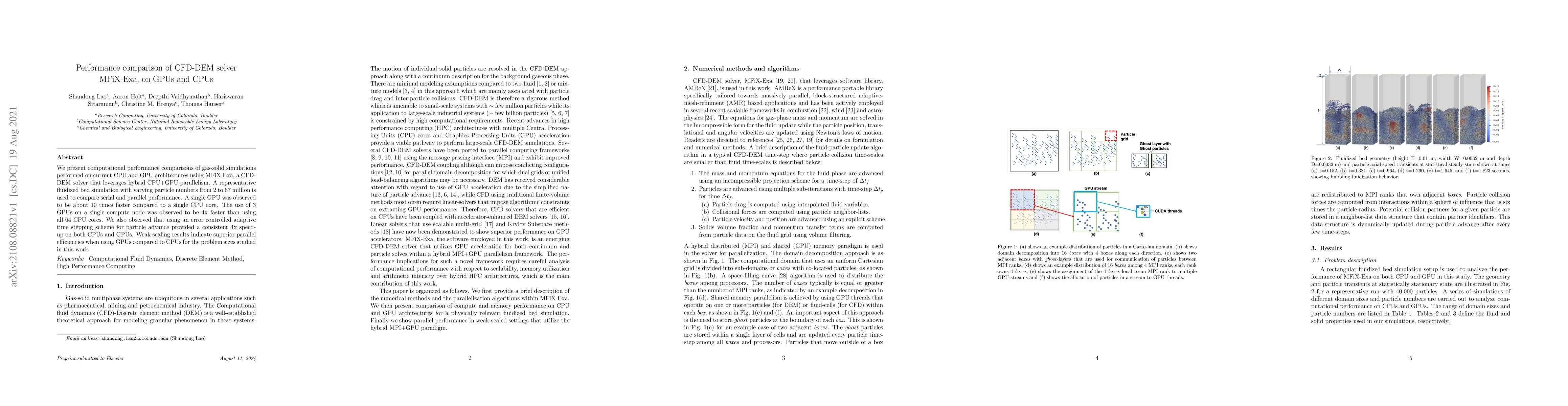We present computational performance comparisons of gas-solid simulations performed on current CPU and GPU architectures using MFiX Exa, a CFD-DEM solver that leverages hybrid CPU+GPU parallelism. A representative fluidized bed simulation with varying particle numbers from 2 to 67 million is used to compare serial and parallel performance. A single GPU was observed to be about 10 times faster compared to a single CPU core. The use of 3 GPUs on a single compute node was observed to be 4x faster than using all 64 CPU cores. We also observed that using an error controlled adaptive time stepping scheme for particle advance provided a consistent 4x speed-up on both CPUs and GPUs. Weak scaling results indicate superior parallel efficiencies when using GPUs compared to CPUs for the problem sizes studied in this work.
